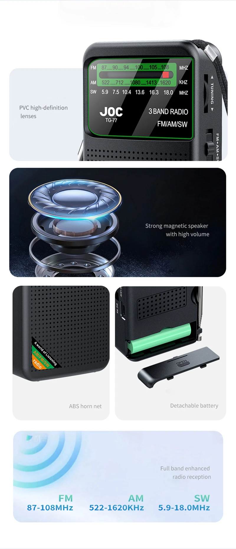 Tune into AM, FM, and Shortwave (SW) frequencies for a wide variety of stations.