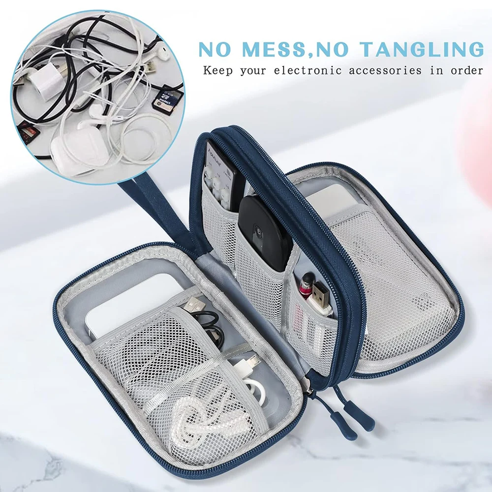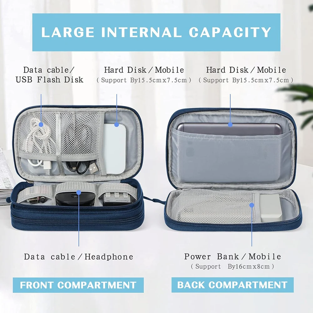 The electronics storage bag has 2 layers interior compartment with enough space to take in your cords, cables, USB drive, cellphone, charger, mouse, flash drive, and other accessories.