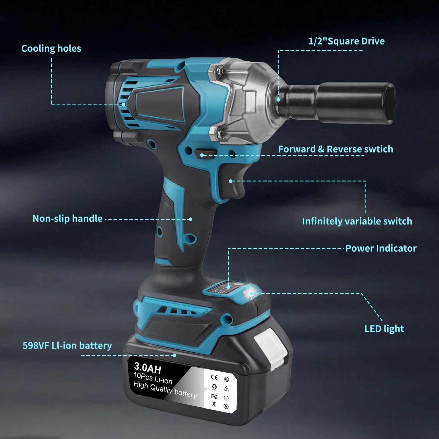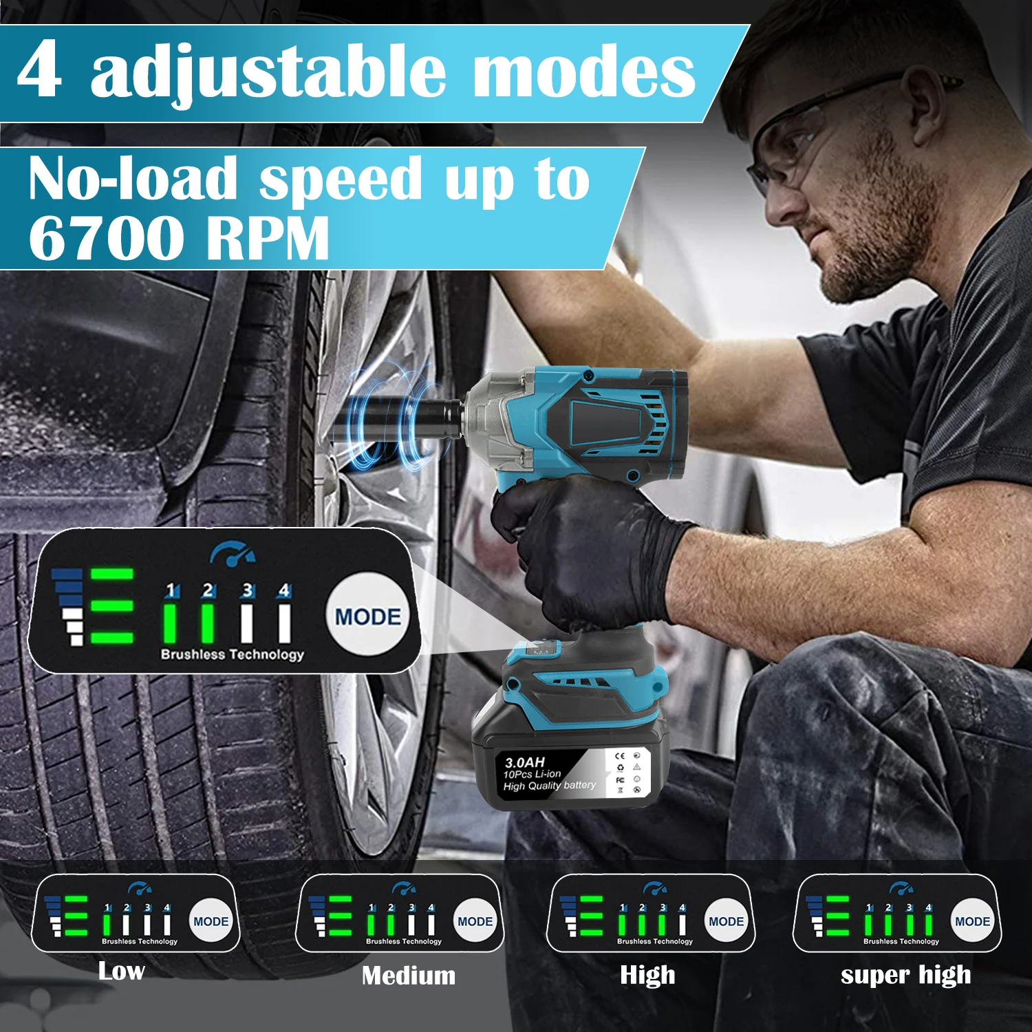 This cordless impact wrench is perfect for all your different work scenarios! It has four gears to switch between, so you can choose between low and high gears. It is easy to use, gives you more precise control and saves more power.