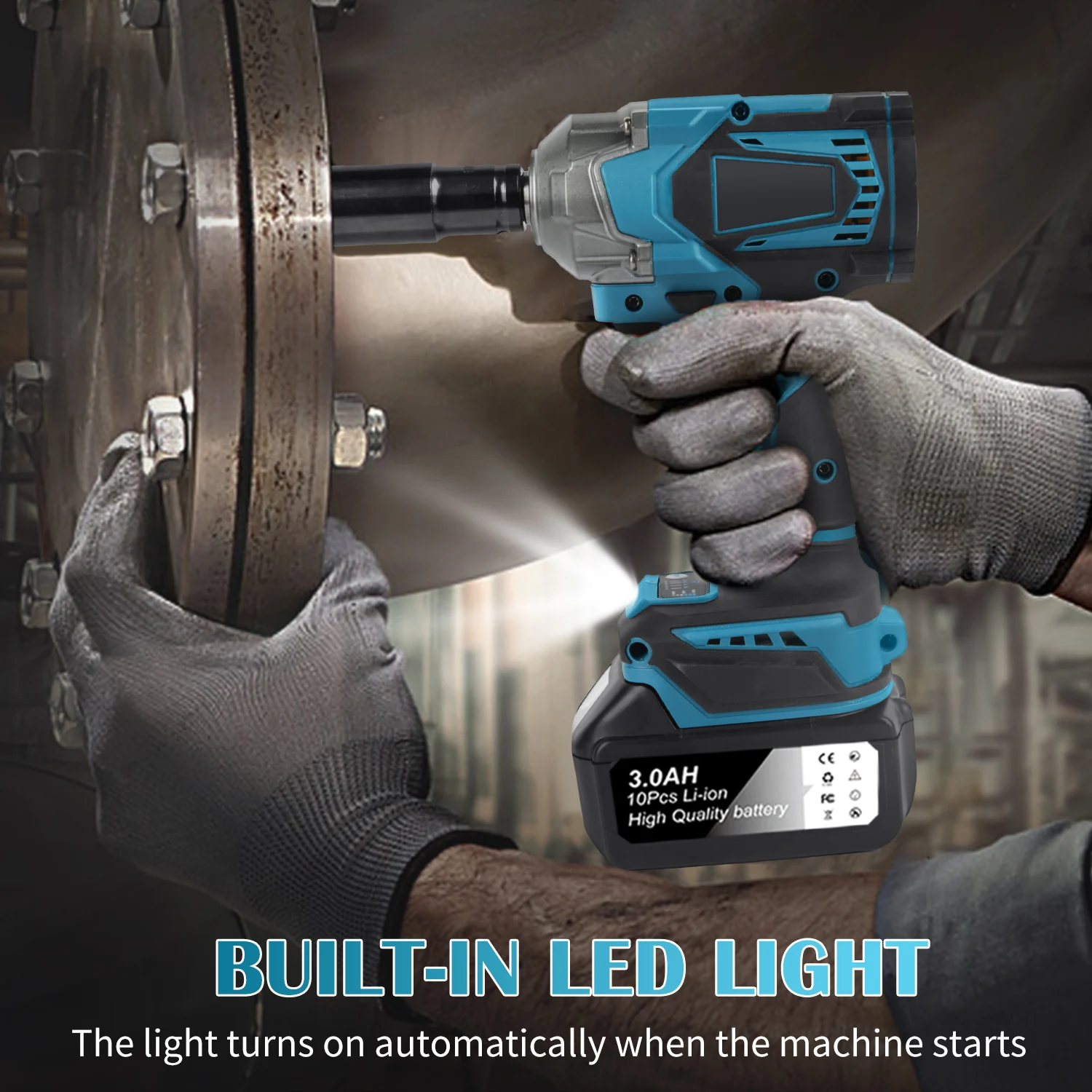 This brushless impact wrench comes with an LED light that you can easily turn on and off, making it perfect for working at night or in delicate areas.