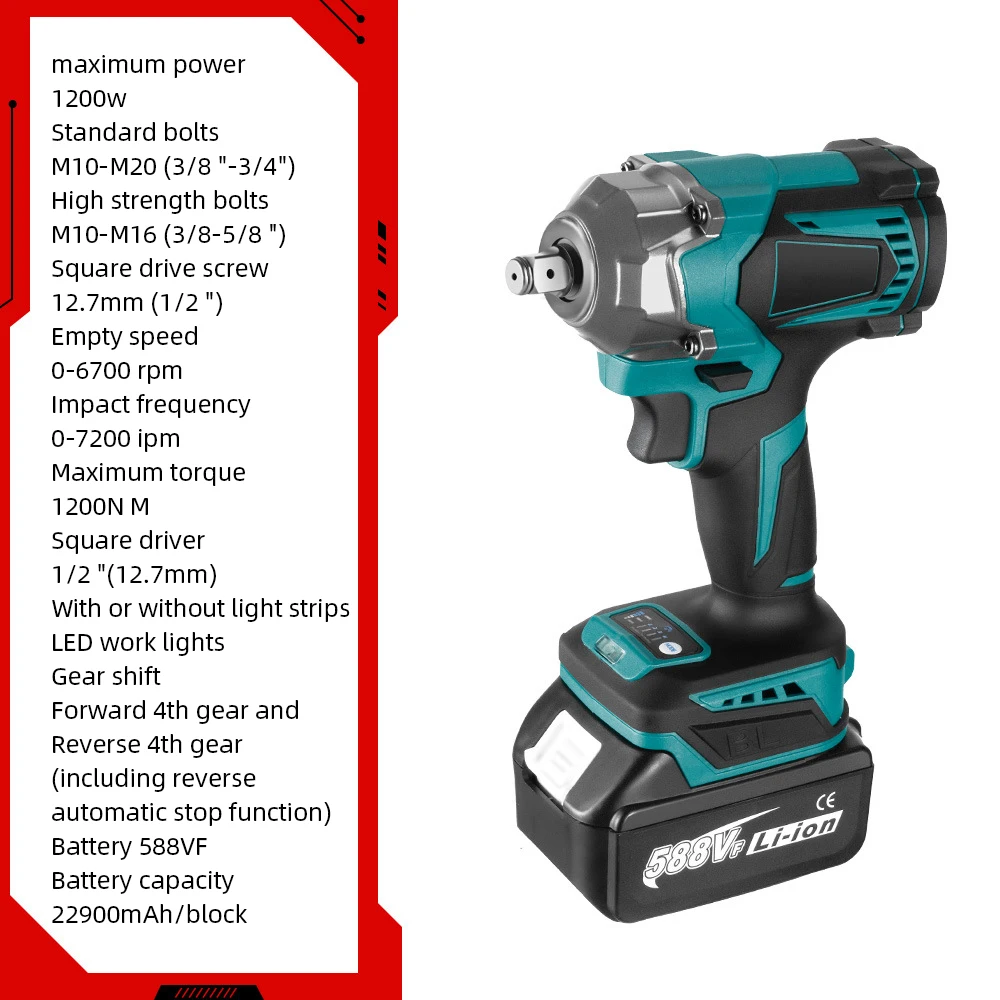 Revolutionize your automotive and DIY projects with the 1200N.M Brushless Cordless Impact Wrench 1/2 Inch. This electric screwdriver power tool, compatible with Makita 18V batteries, delivers an impressive 1200N.M high torque for versatile and super powerful performance. The continuously variable transmission switch allows for precise control, while the tungsten steel shaft ensures durability and wear resistance. Perfect for construction, maintenance, and woodworking, this wrench features a brushless motor that operates spark-free and remains wear-resistant over time. Equipped with LED work lights, this tool guarantees enhanced visibility in any workspace. The impact wrench boasts an idle speed of 0-6700 rpm and an impact frequency of 0-7200 ipm, making it a reliable companion for various tasks. With 8 gears and a 1/2" Fang Drive, this tool offers exceptional flexibility and control. Upgrade your toolkit with this powerhouse wrench that brings efficiency and ease to your projects.