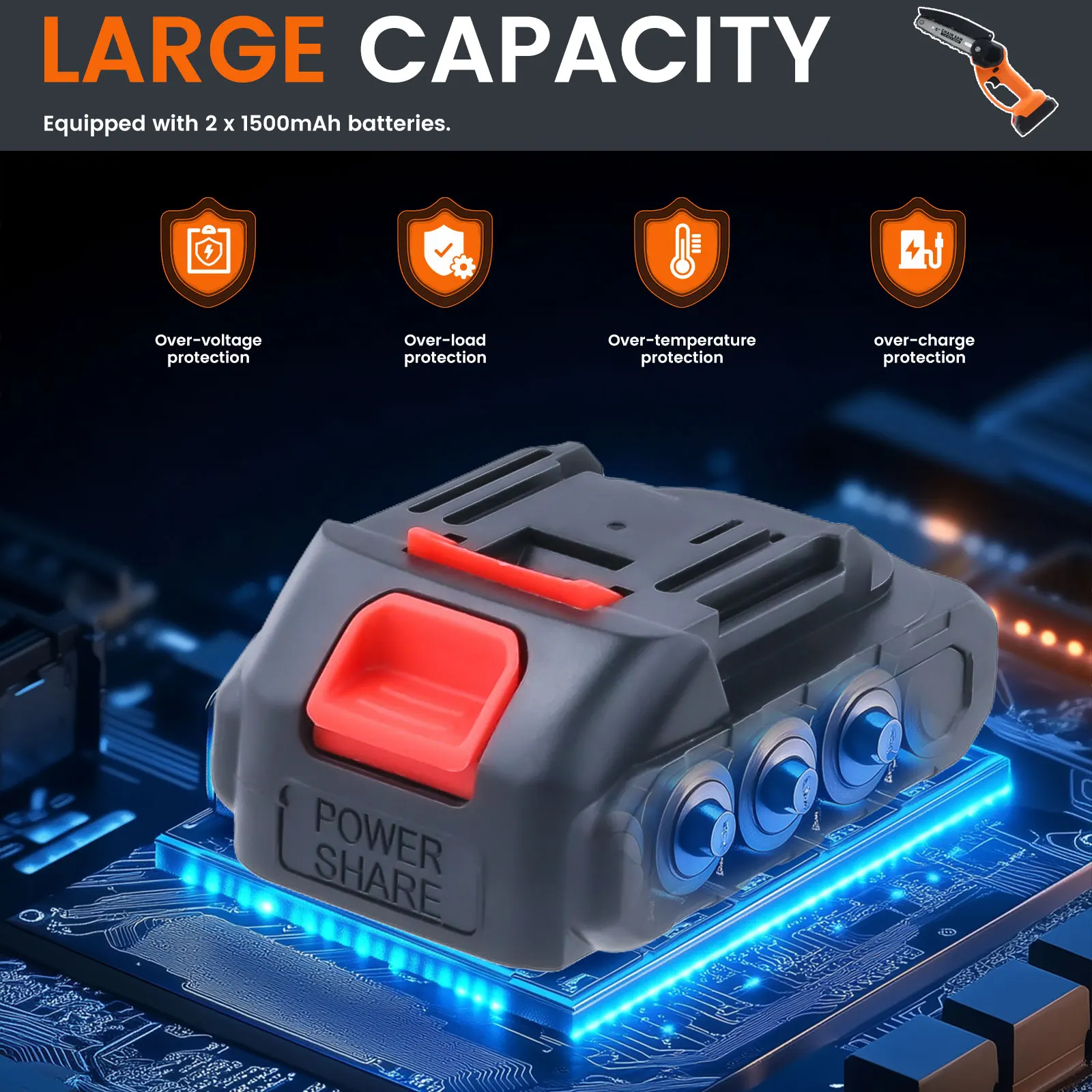 2. Rechargeable Battery: Mini chainsaw It is equipped with two 2 pcs of 21V-1500MAH rechargeable batteries.