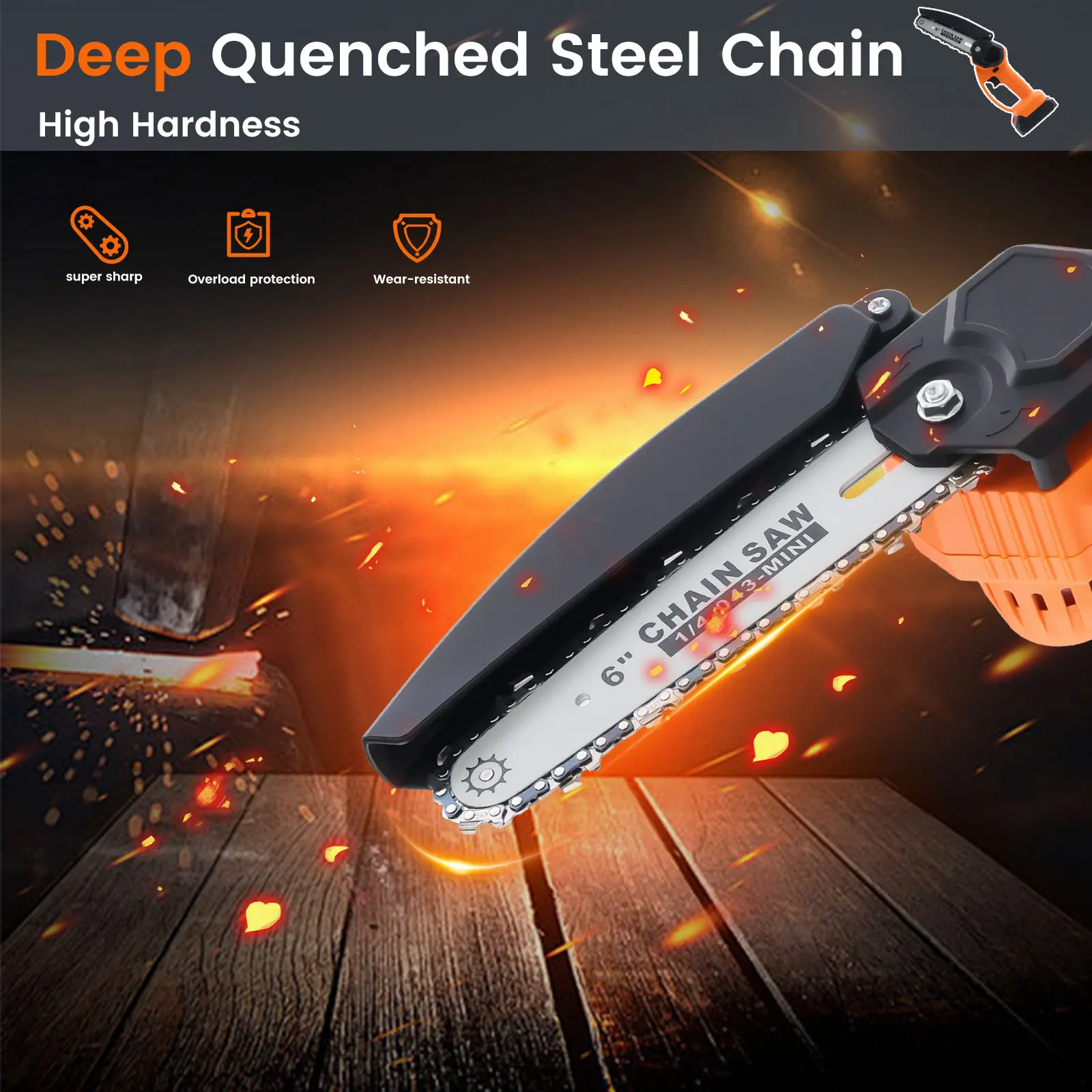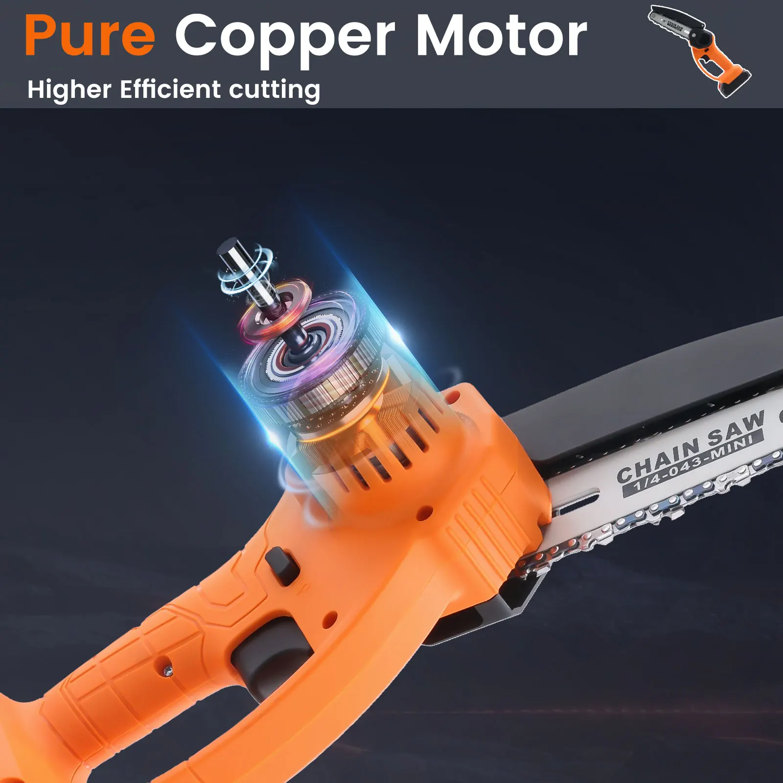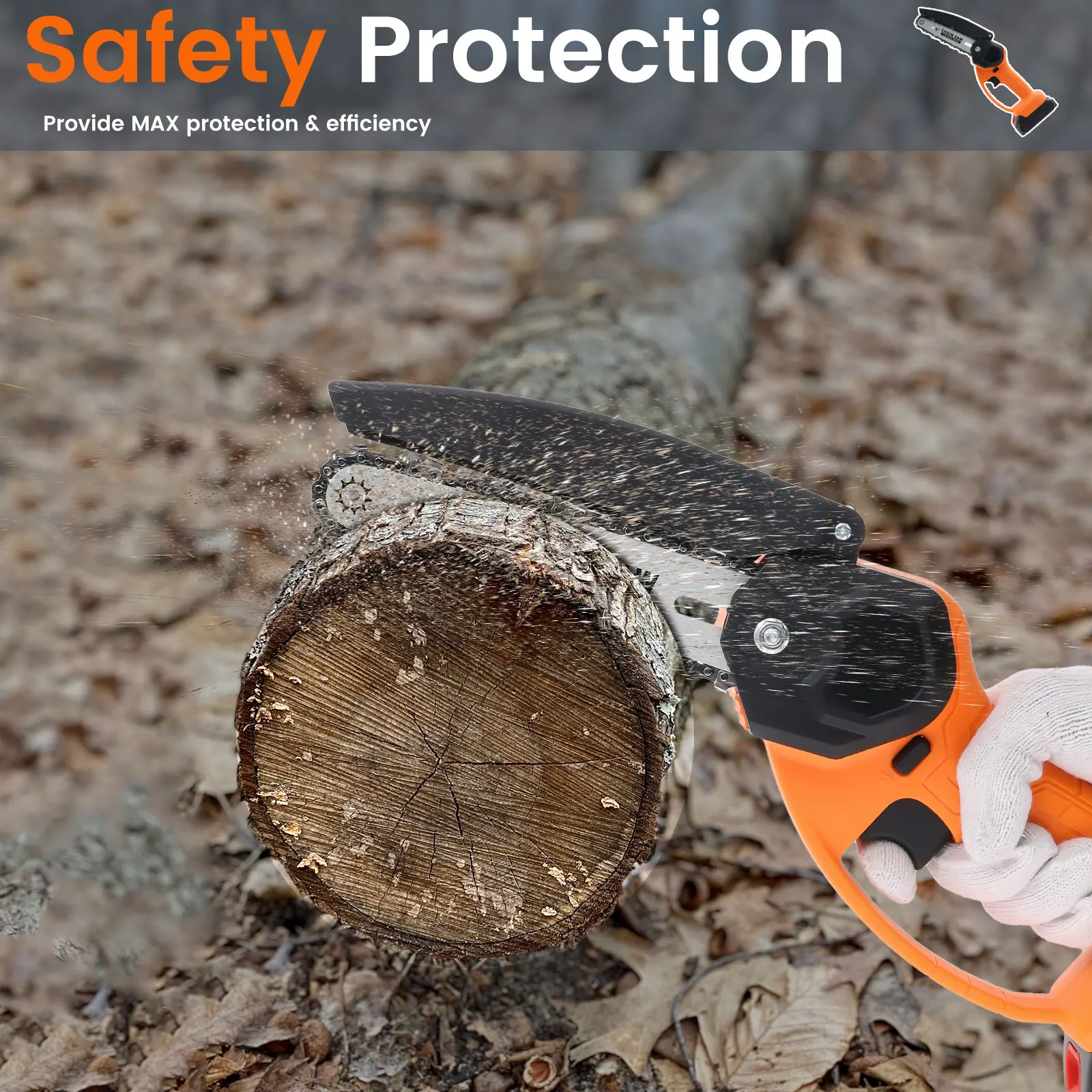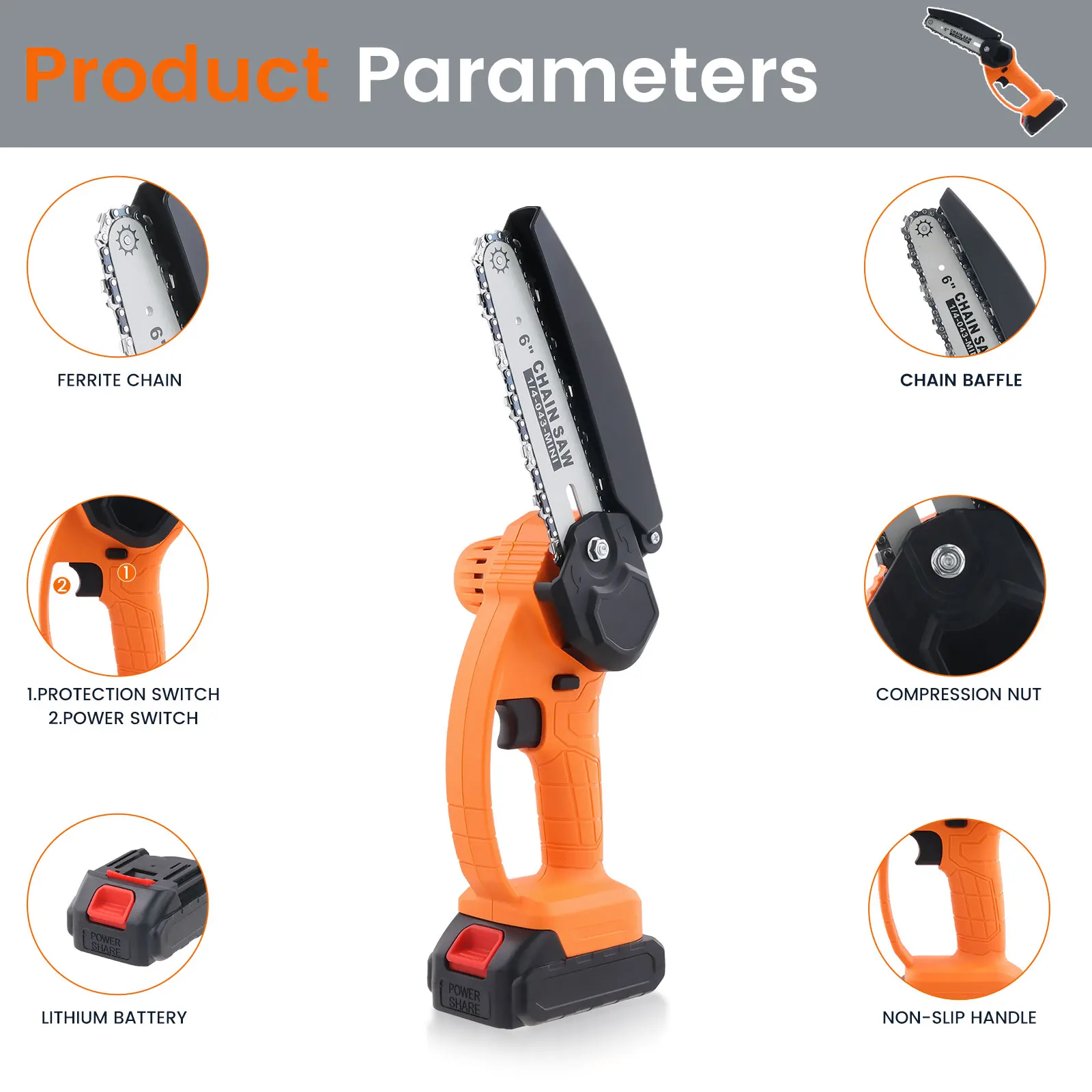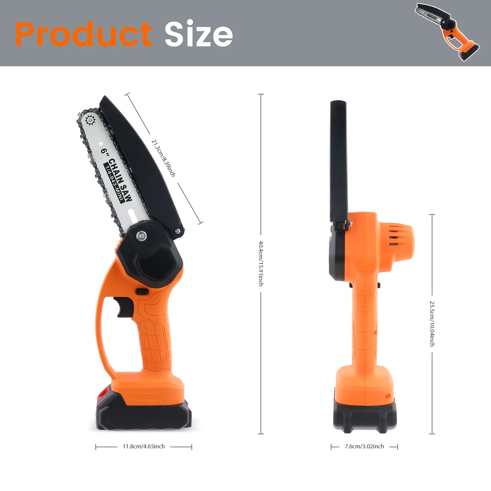 1. mini Chainsaw: Ergonomic light mini chainsaw. The mini chain saw adopts updated chip technology and high-quality gear. gear design to ensure smooth cutting. Whether felling common trees at home gold large log at work, it can be done easilly and efficient.
