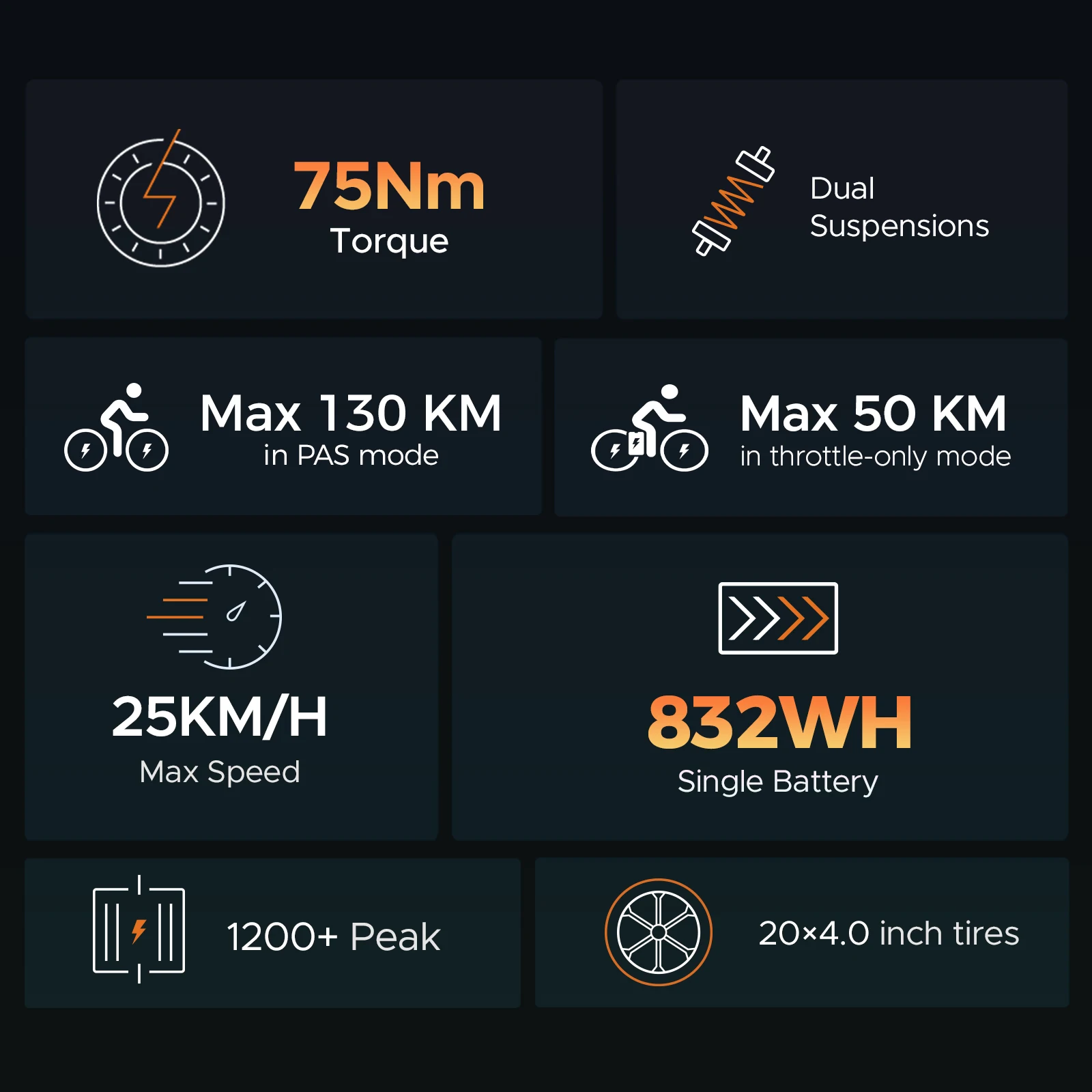 HillMiles MileZoom 1 Ebike 52V 31.2Ah Dual Battery 20*4.0 Inch Fat Tire Electric Bicycle Mountain Snow Adult Electric Bike