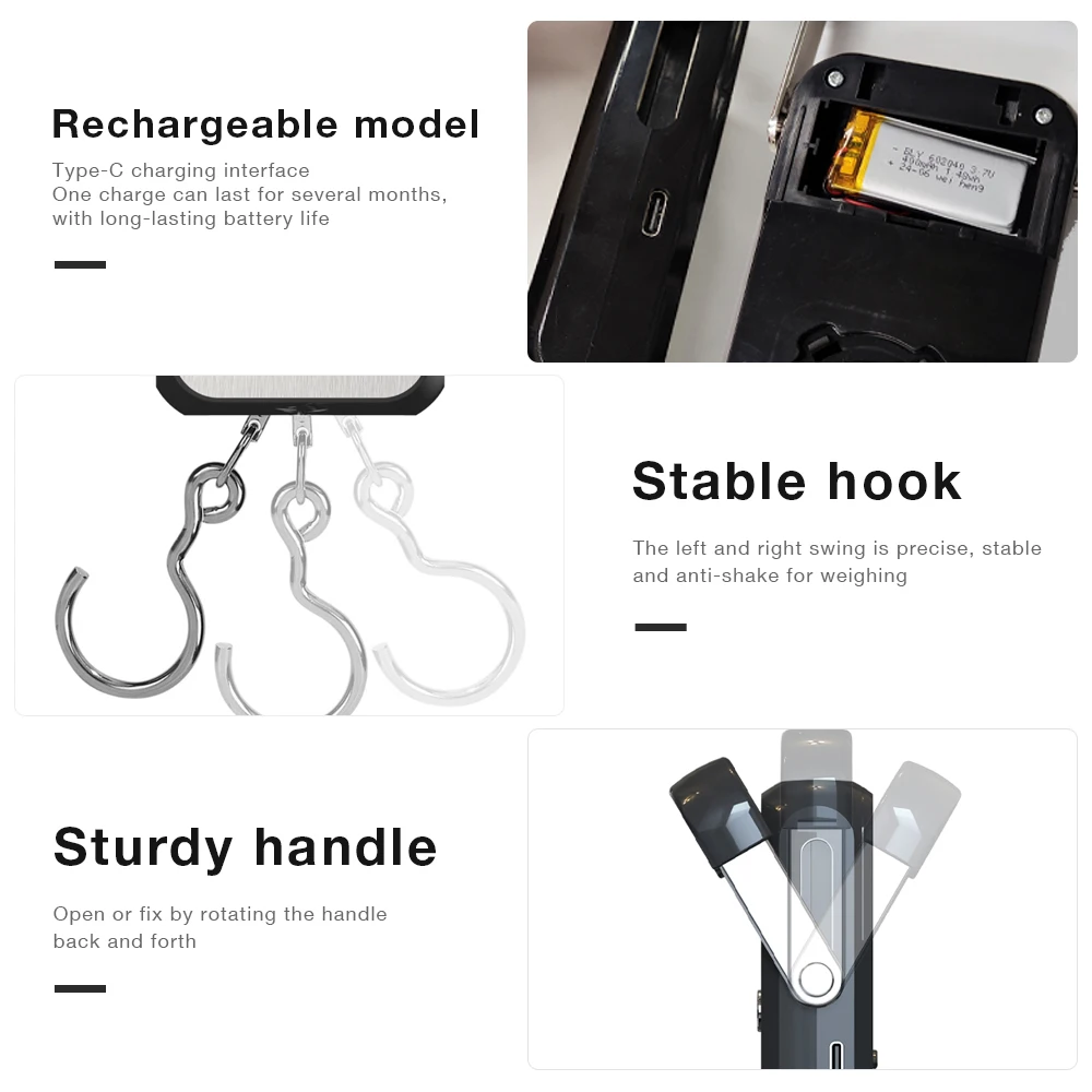 3. It can hold 4 fingers and easily lift heavy objects. The hook can be stored and hidden at the back, and the hook is also designed with a patented structure. The scale body is tilted at a positive or negative 15 degree angle for precise weighing;