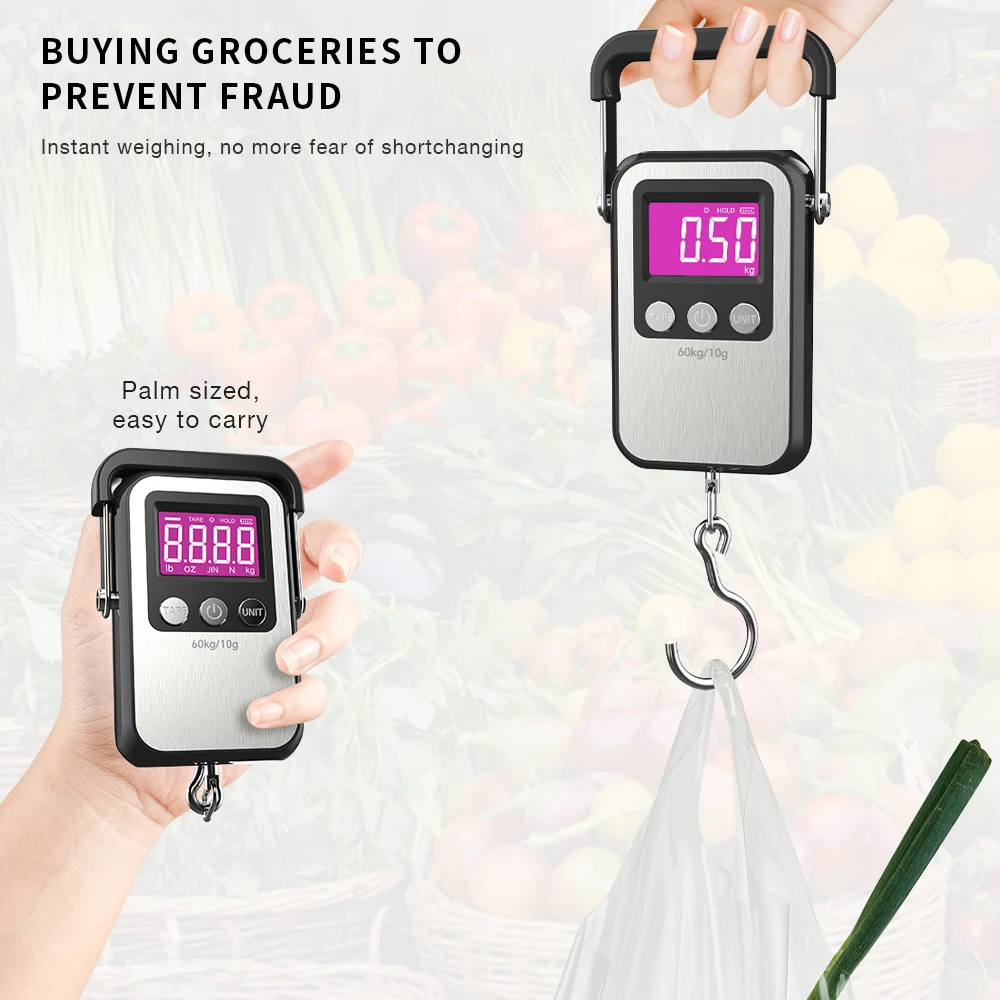 60Kg/10g Stainless Steel Portable Scale Rechargeable Hanging Scale LCD Digital Hook Scale Luggage Fishing Scale for Household