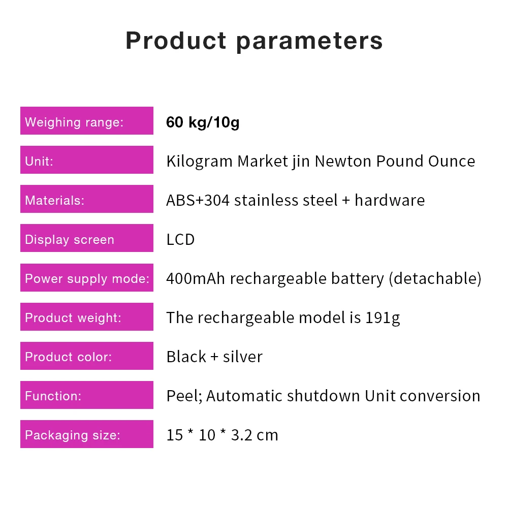 6. Color: Black; Purple background white light backlight source; Casual and fashionable, exquisite and high-end, easy to carry, suitable for family shopping, weighing, fishing, express delivery, etc