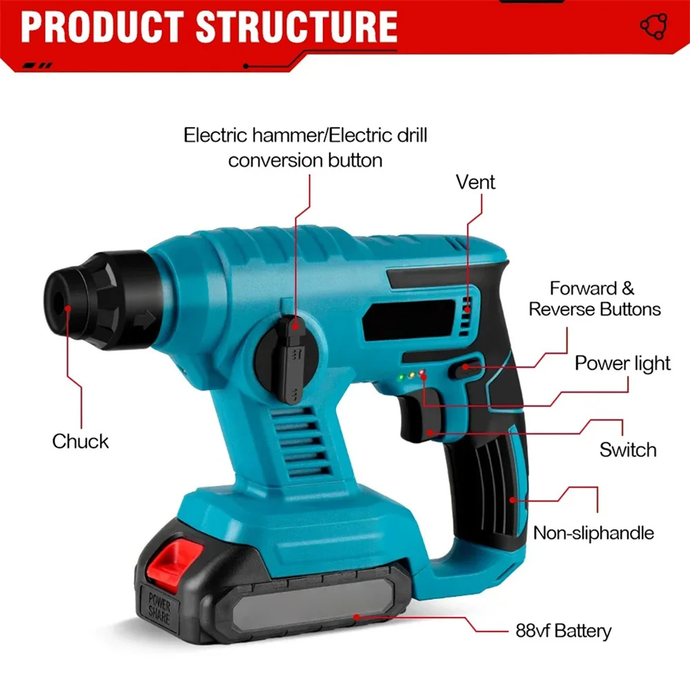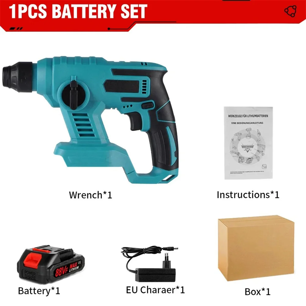 Product Sell pointsEquipped with a robust 1000W motor, this delivers powerful impacts for efficient demolition.8600IMP Impacts Per Minute:With 8600IMP impacts per minute, this hammer drill ensures rapid progress in your renovation tasks.Versatile Battery Compatibility:Compatible with 18V batteries, this hammer offers seamless integration with your power equipment.Dual Working Modes:Switch effortlessly between hammer and drill modes with the hammer, enhancing your versatility on the job.', Waterproof Design:The hammer's waterproof design ensures reliable performance in wet conditions, making it ideal for outdoor use.Specifications:Material:PlasticColor:BlueBattery:1/2pcs batteryMaximum output power: 1000wSpeed: 0-3600rpmNumber of impacts: 0-8600ipmAbility:Concrete: 16mmSteel: 13mmWood: 20mmWorking mode: 2 modesSound pressure level: 94 dB(A)Battery: 88VFBattery capacity: 9000mah/blockFeatures:-Rubber sealed circuit board, dustproof, waterproof and shockproof.-Electric hammer/Electric drill function switch freely.-Suitable for Granite/Bearing wall/ Lightweight concrete/brick wall etc..Note1. Please allow a bit error due to manual measurement.2. The color may have different as the difference display, please understand.Package Included:Option 1machine*1Accessories*1User manual*1Battery*1Charger*1Option 2machine*1Accessories*1User manual*1Battery*2Charger*1