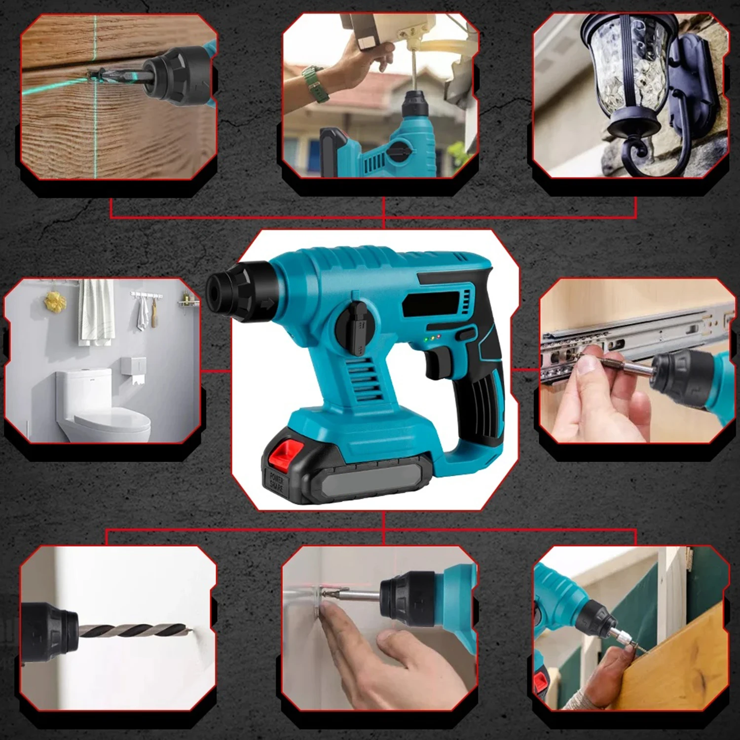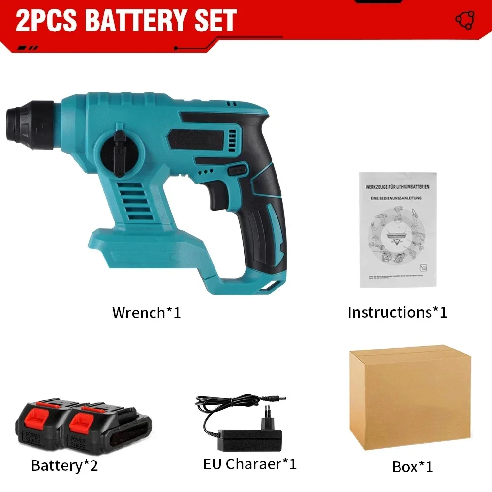 1000W Electric Hammer Multi-function Cordless Electric Drill Rechargeable Power Tool for Granite/Bearing Wall for 18V Battery