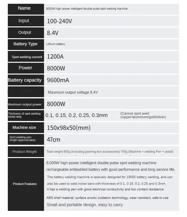 Total Weight: 900g (Including box and accessories), 700g (Machine + Welding Pen + Foot Pedal)