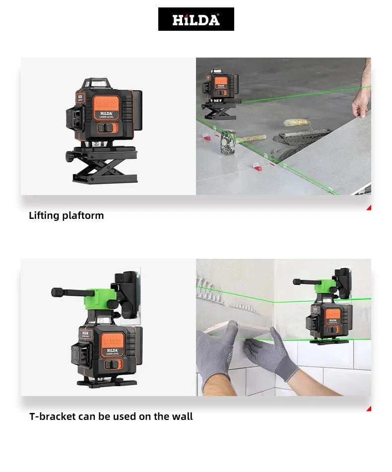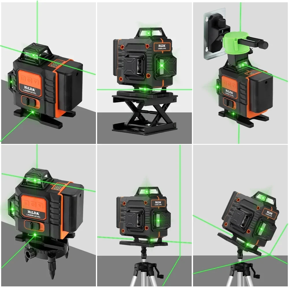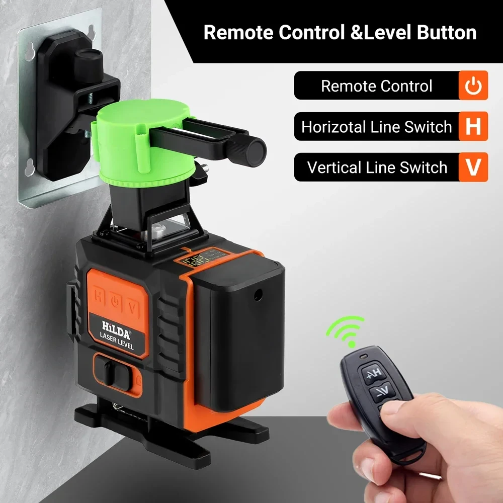 HILDA 16-Line 4D Green Laser Level - Self-Leveling IP54 Waterproof with Battery Display, 360° Horizontal/Vertical ±1/9"@33ft, 200ft Range with Receiver, 6H Runtime for Construction/Remodeling