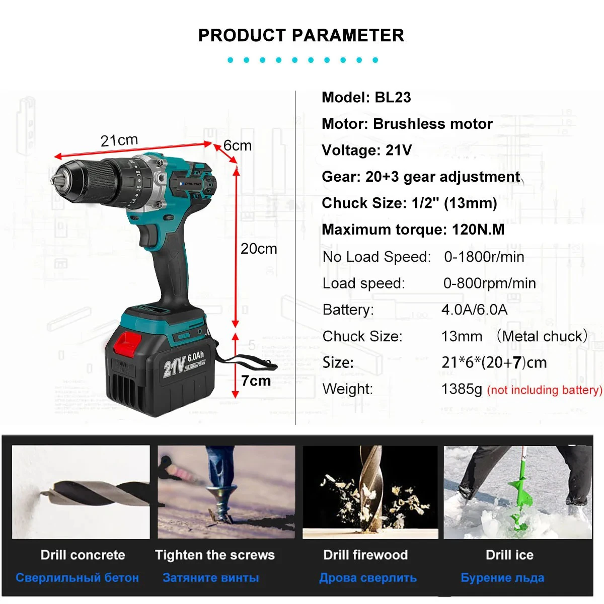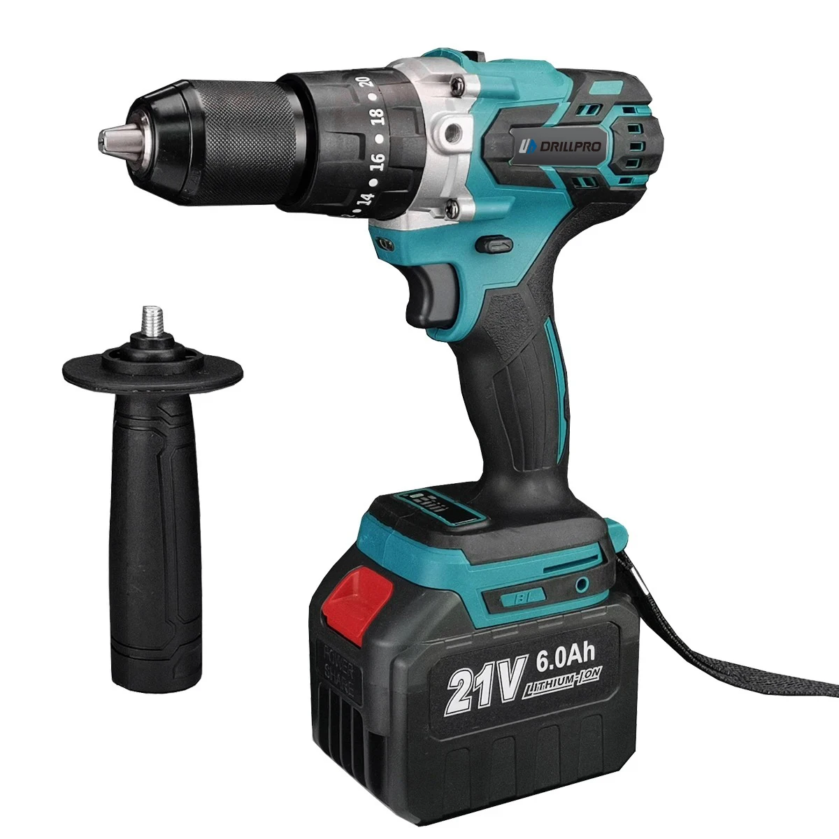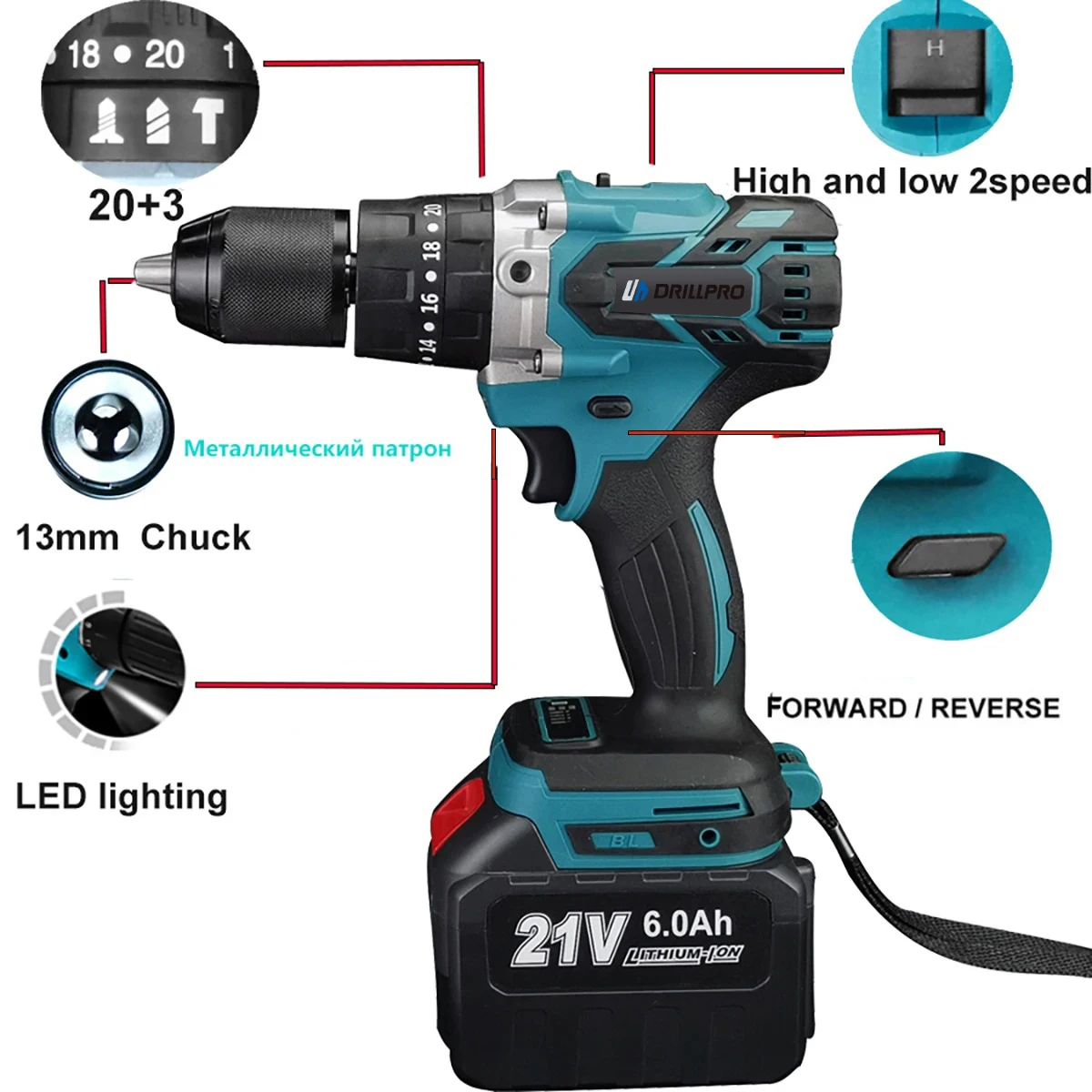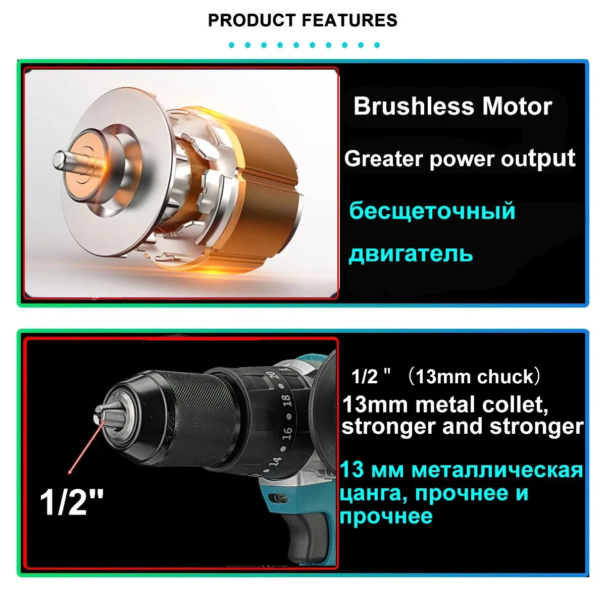 Drillpro Brushless Electric Impact Drill 1/2" Chuck Rechargeable Cordless Screwdriver Impact Power Tools for Makita 18V Battery