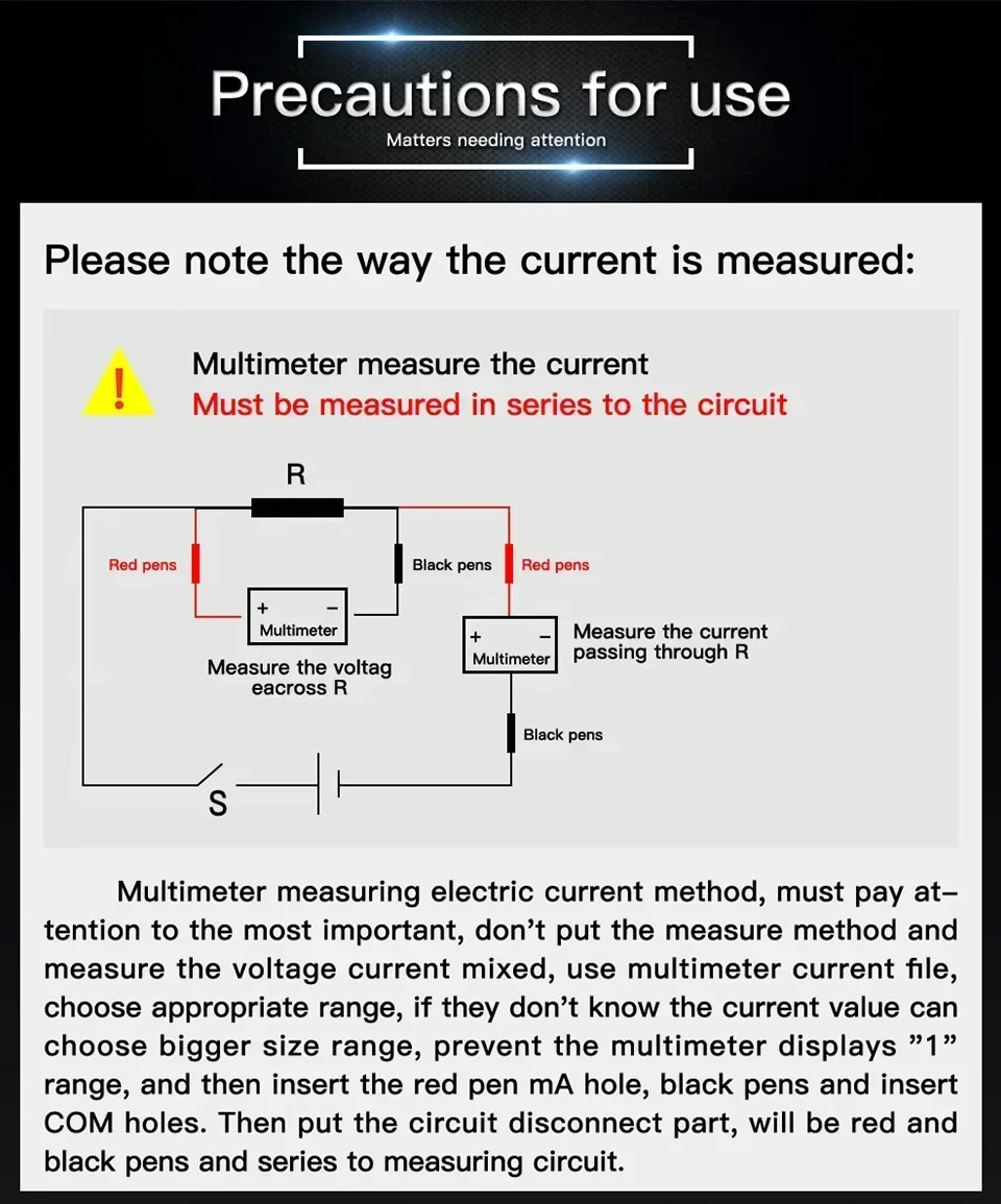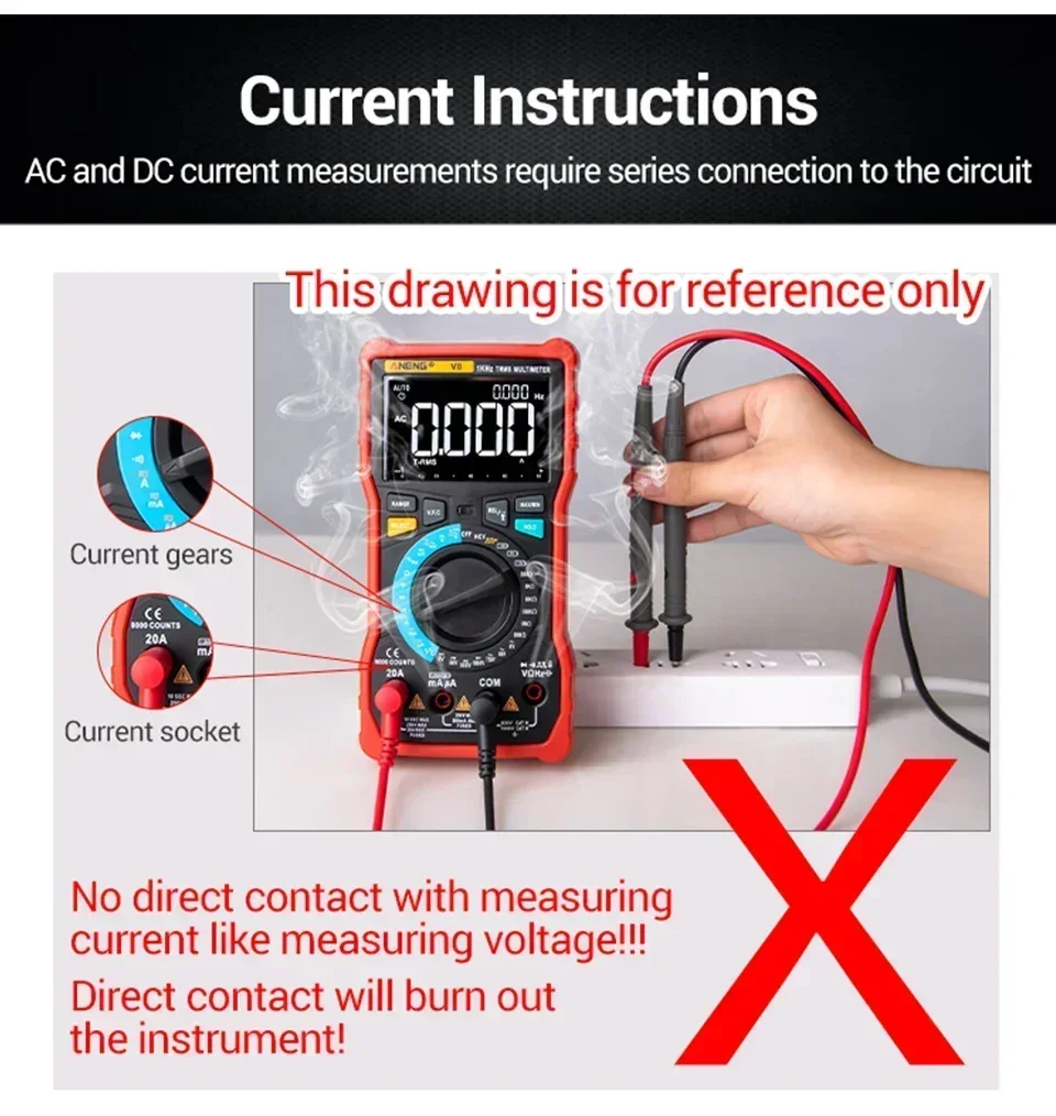 2. Do NOT input voltage at the Current Mode, the Resistance Mode, the Diode Mode, the Continuity Mode, or the Temperature Mode;