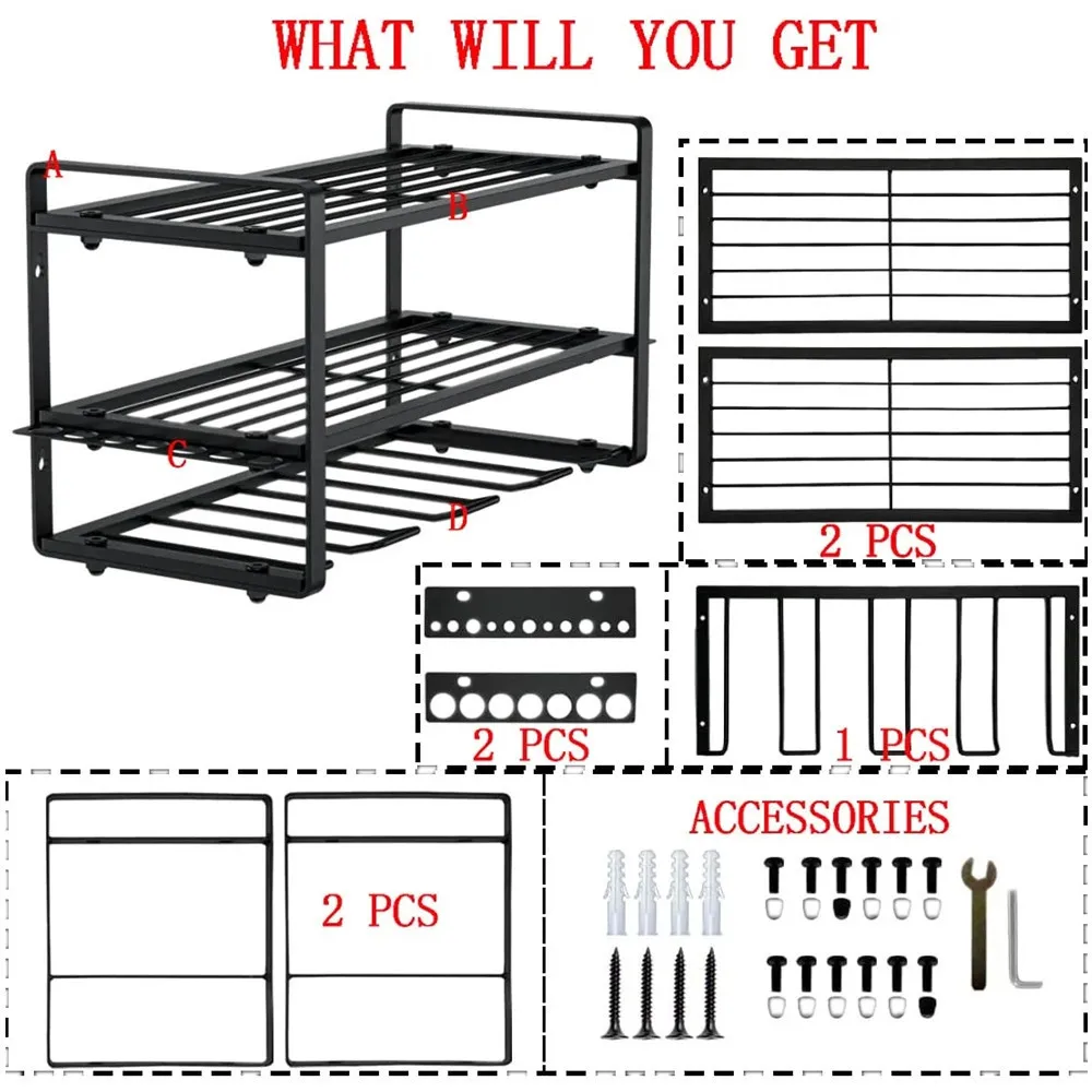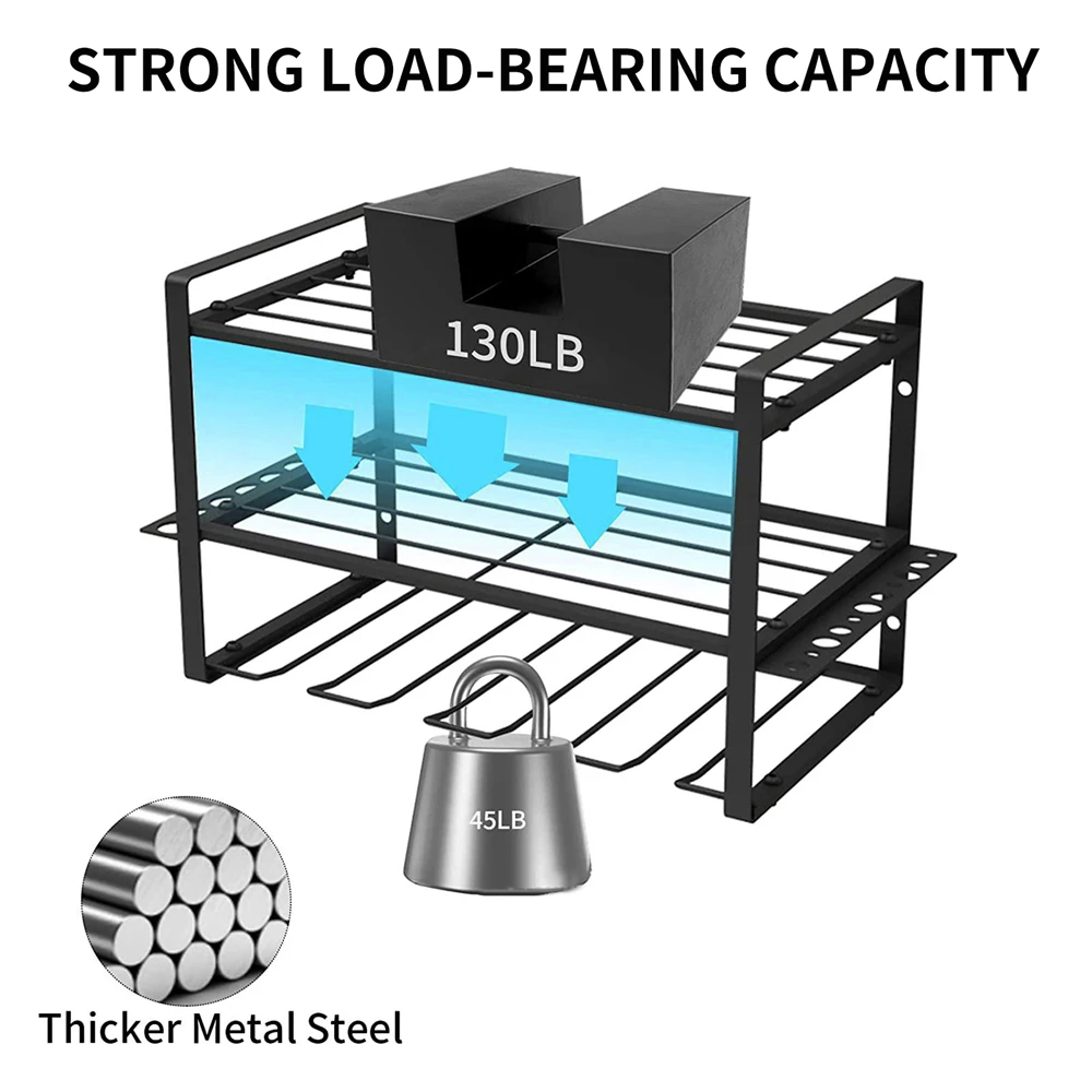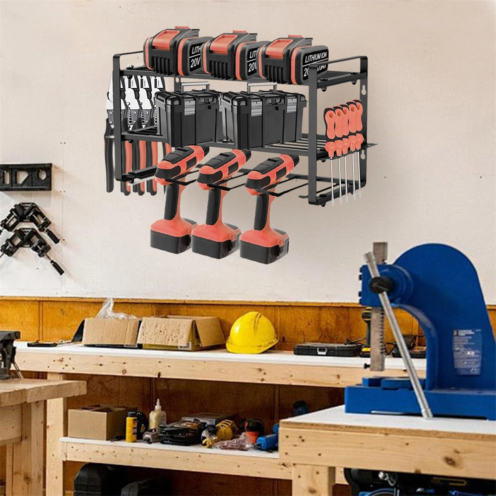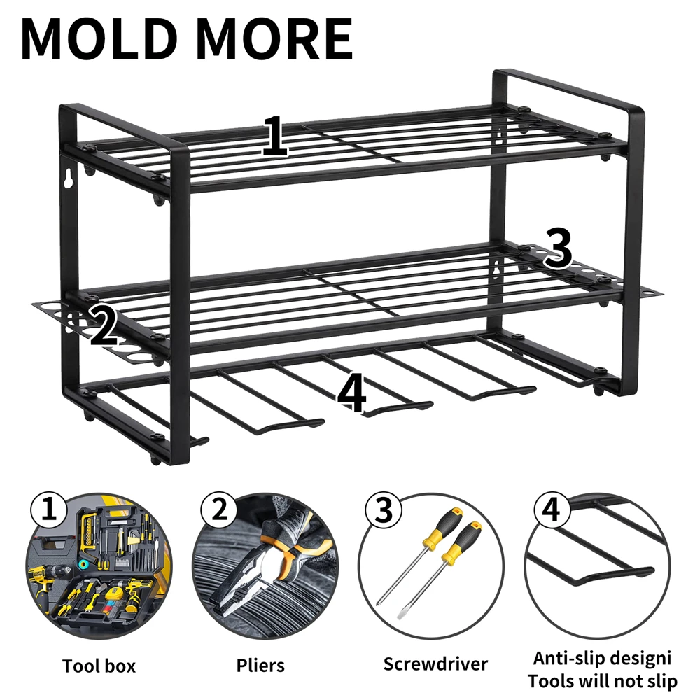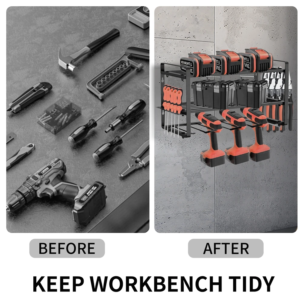 HEAVY DUTY: This drill holder can carry up to 20 kg. The 4 slots are perfect for storing electric drills, and the 2 layers are suitable for storing circular saws, large hammers, or large tool boxes.