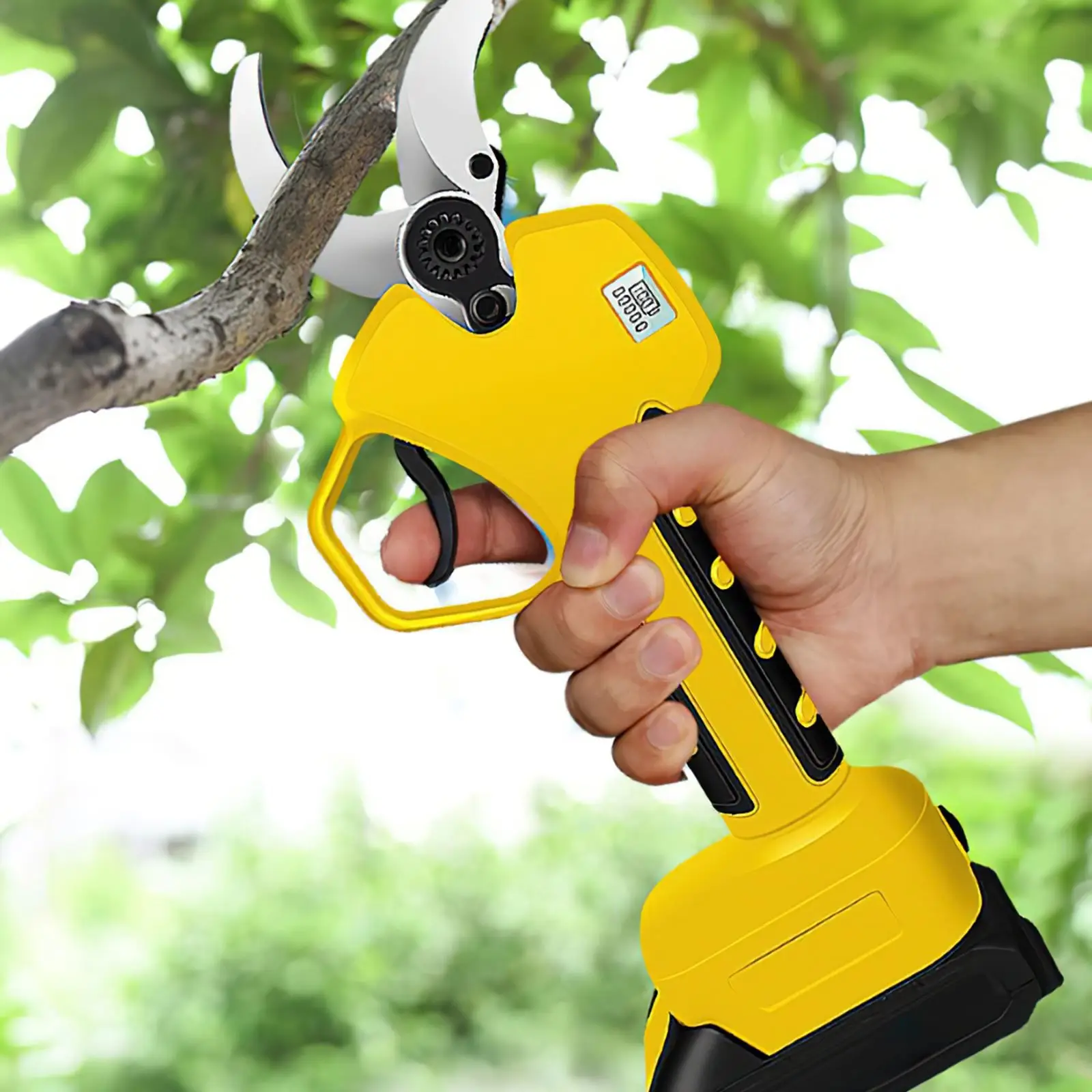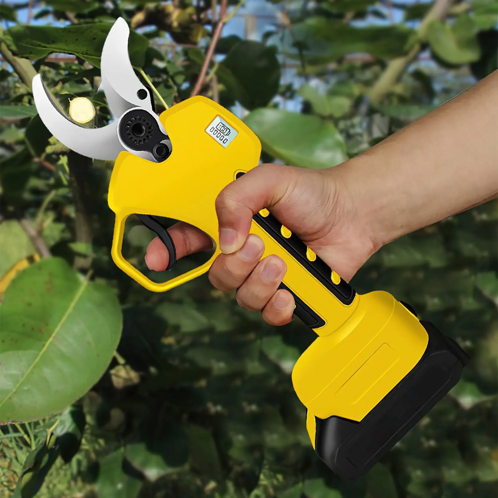 When you turn on the power switch, you will hear a "beep" sound. Then you need to press the trigger quickly twice, and the LCD screen will light up. You will hear the "beep" sound again, and then press the electric scissors. The ergonomic handle is made of soft anti-slip rubber, which helps relieve hand pain during long pruning and makes the pruning more comfortable and easy.