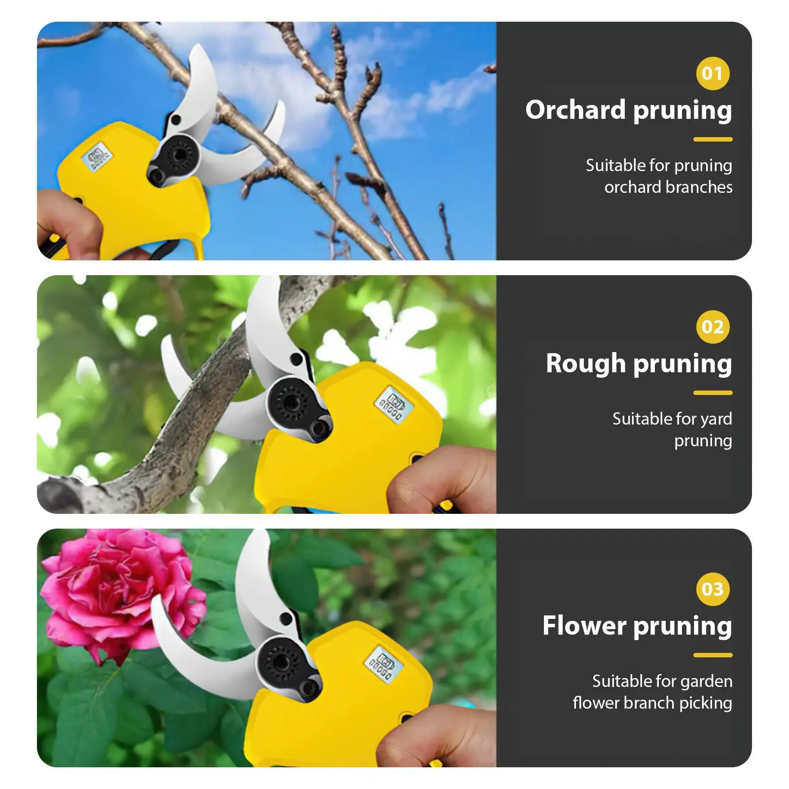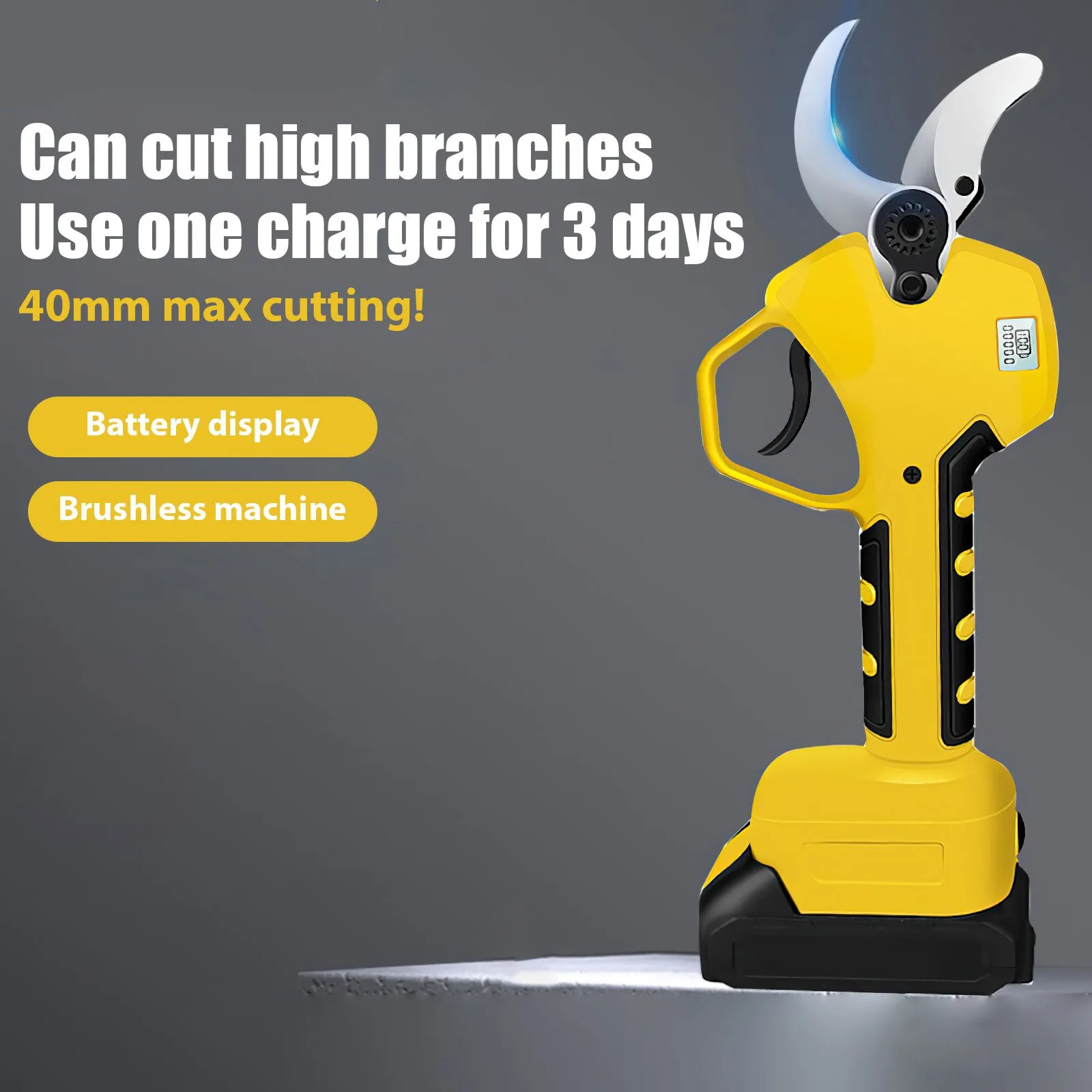 It has a wide range of applications and the diameter of the scissors can be adjusted according to different pruning scenarios. Press and hold the trigger for 3 seconds to switch between cutting modes.