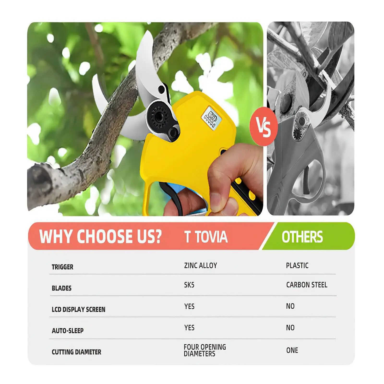 The cordless electric scissors adopt advanced SK5 high-carbon steel blades, which are extremely sharp, do not rust and are very durable. It can easily cut hard branches up to 40 millimeters thick.