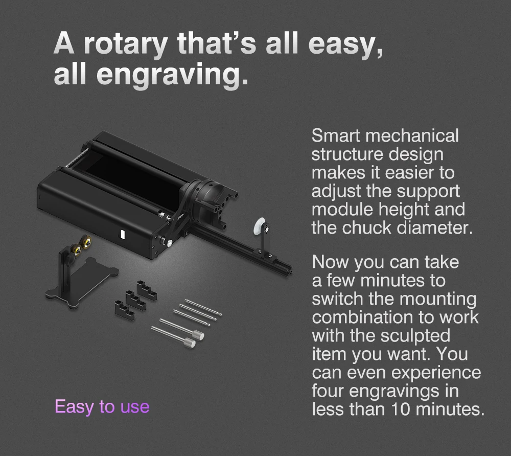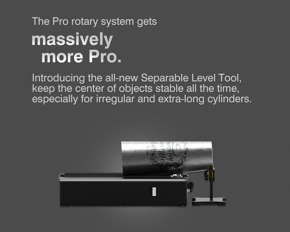 Made of anodized aluminum alloy with a corrosion-proof coating to ensure long-term & reliable use. Compared to other roller rotary attachments, TR2 Pro rotary attachment adds adjustable z-axis and chuck rotary module. It supports 360° engravings on an extra-long cylinder and irregular cylinders like beverage cans, eggshell cups, goblets, wine bottle, baseball, baseball bat Rotable engraving pattem types Image/Line/Text