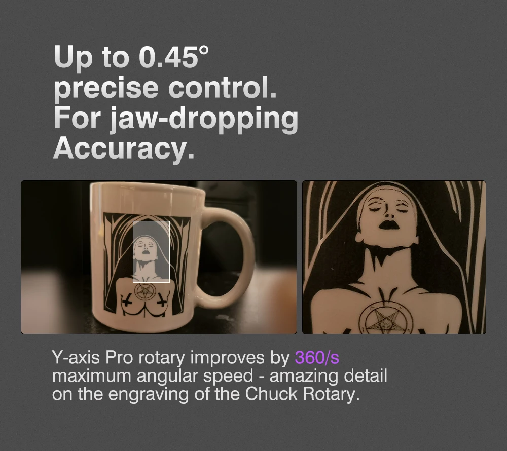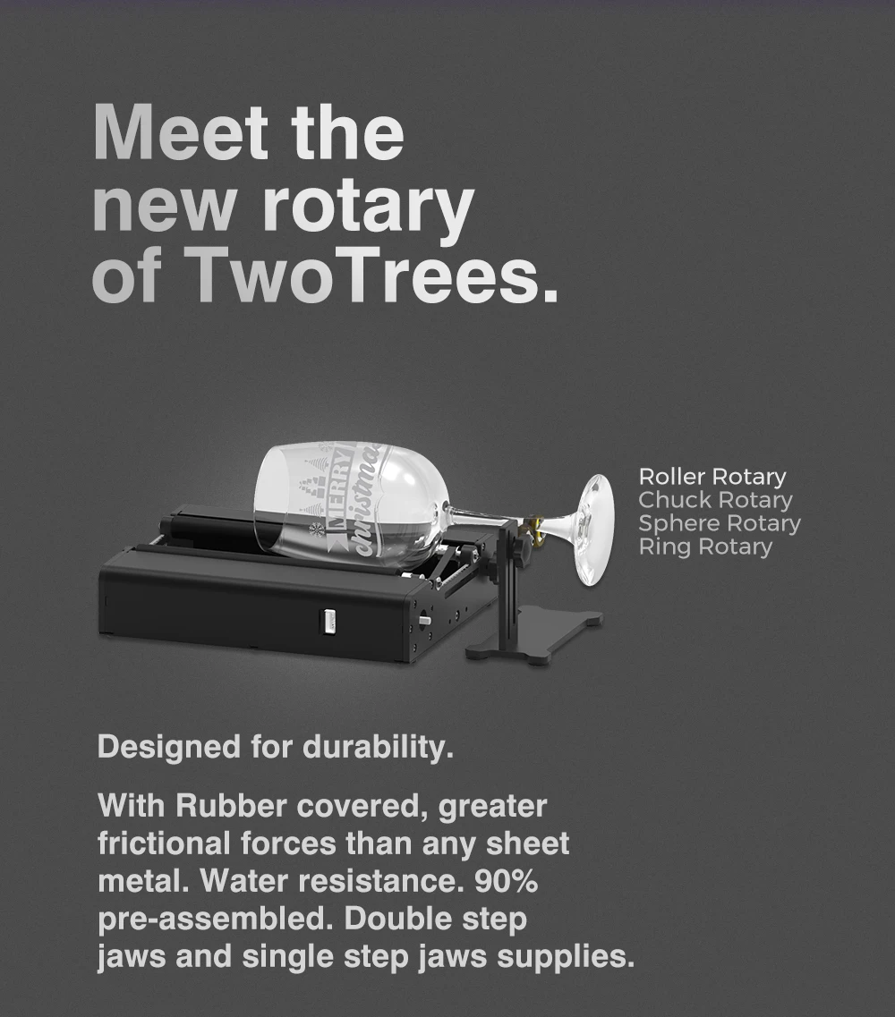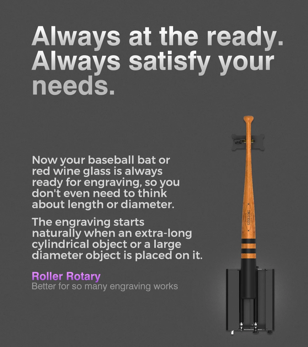 TR2 Pro is the WORLD'S FIRST 4-in-1 laser rotary attachment, including Roller Rotary, Chuck Rotary, Sphere-Engraving Module and Ring-Engraving Stud. You can unleash your creativity on almost all cylinders by changing accessories, such as wine glass, yeti tumbler, baseball bat, ring, ball, or mug with handle