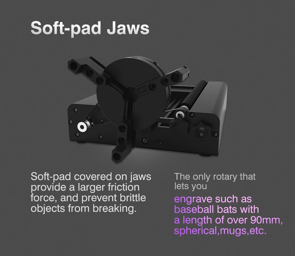 TR2 Pro Rotary module can hold the object tightly with a soft-pad covering jaws chuck, allowing smooth and efficient operation. The maximum vector engraving speed can reach 360°/s.