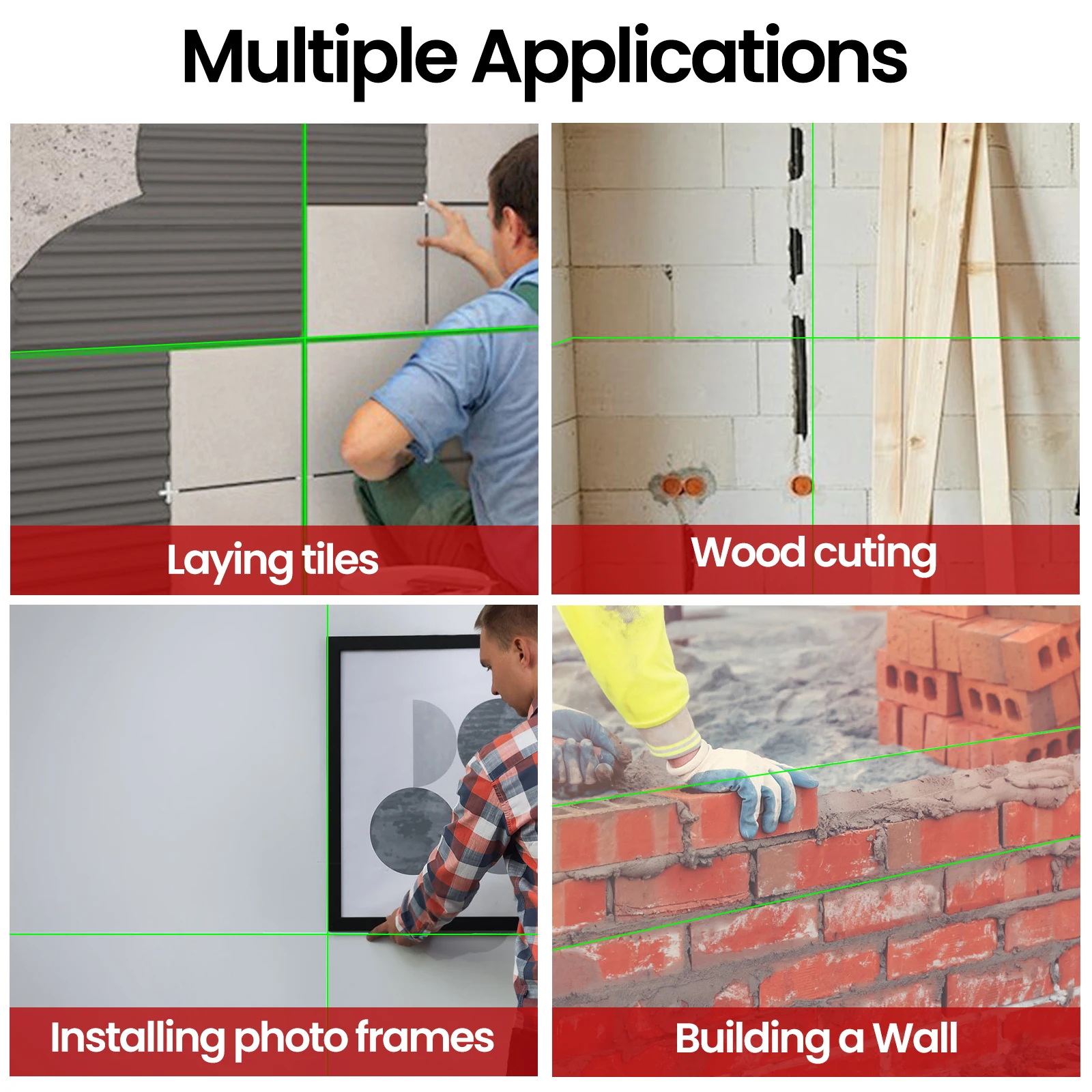 Equipado con una función de autoinspección y calibración, nivelación automática ≤ 3 °, pero si el ángulo supera los 3 °, la luz láser seguirá parpadeando y el medidor de nivel láser emitirá un pitido para recordarle que vuelva a configurar el plano en el suelo horizontal.