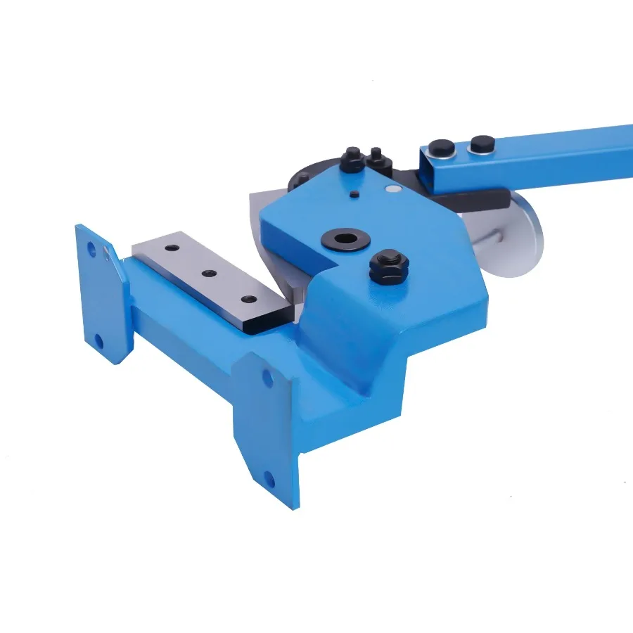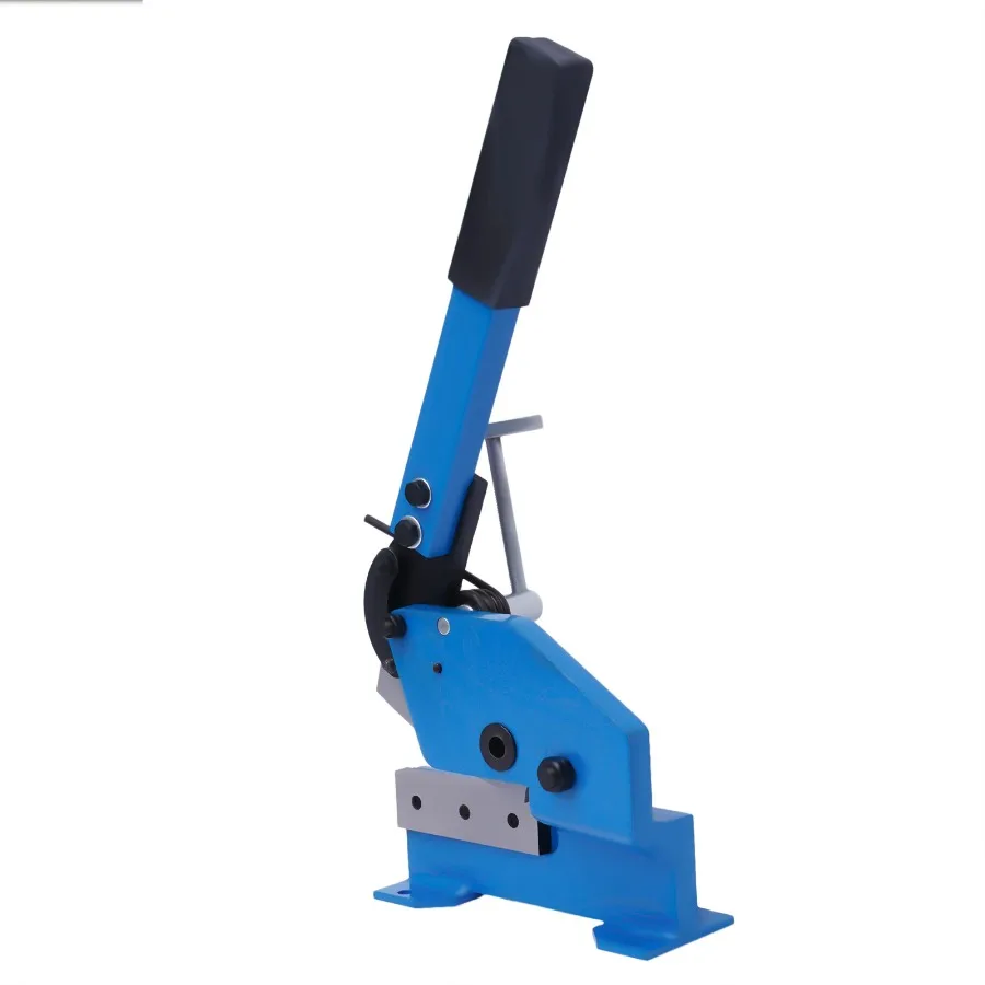Manual sheet metal plate shear is designed to cut sheet steel, flat steel, and round steel. The metal shear cuts 1/4" thick steel plate, 23/4" x 1/4" flat steel, and 1/2" bar steel. The cutting thickness for round steel is 11mm; and 6mm for plate and flat steel.