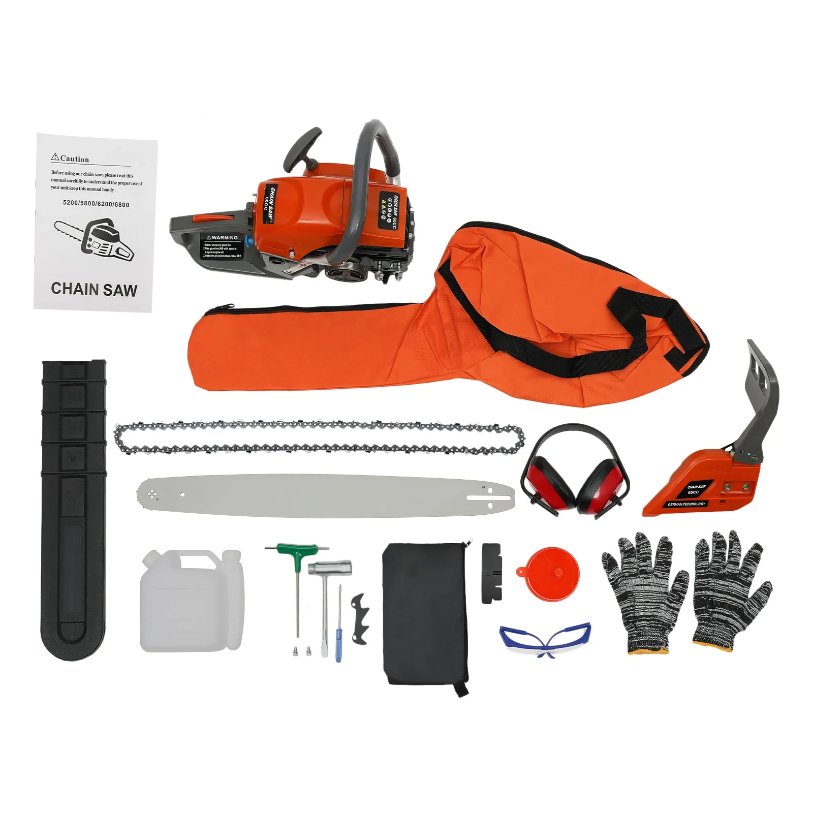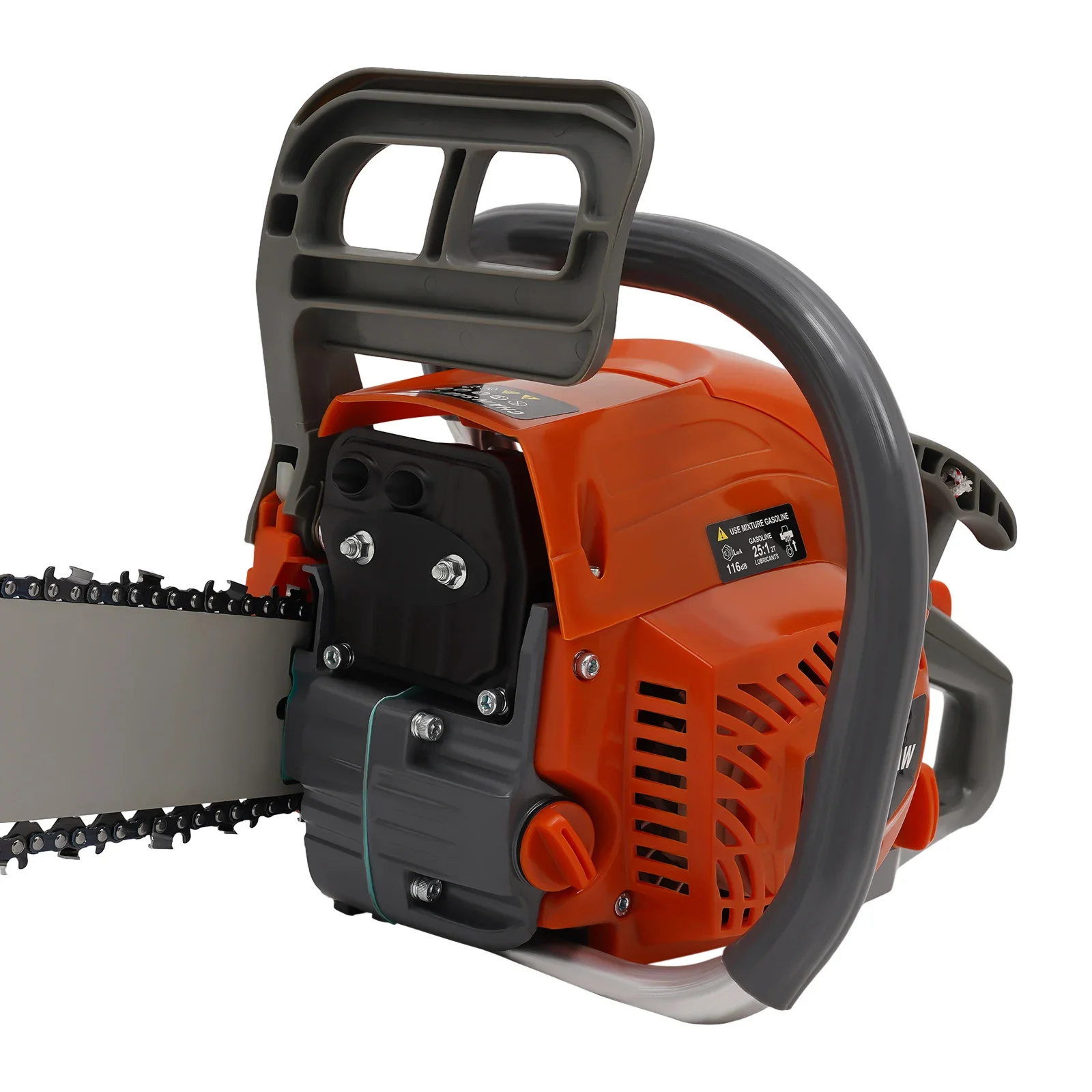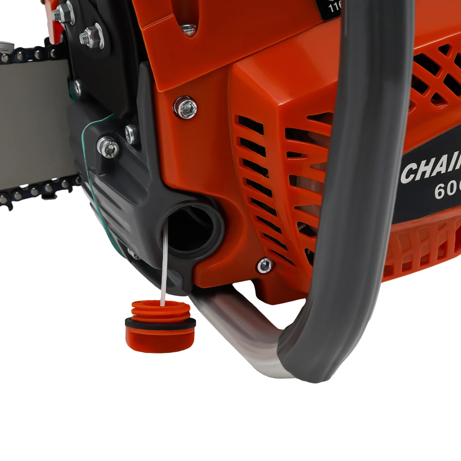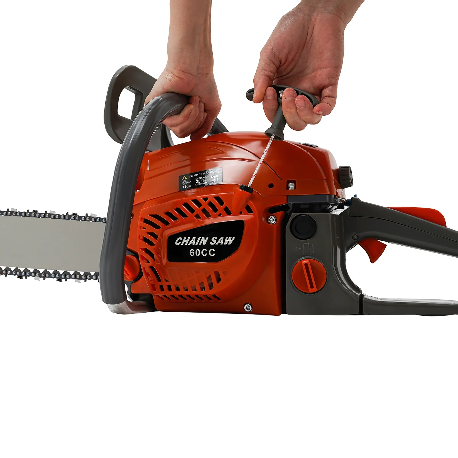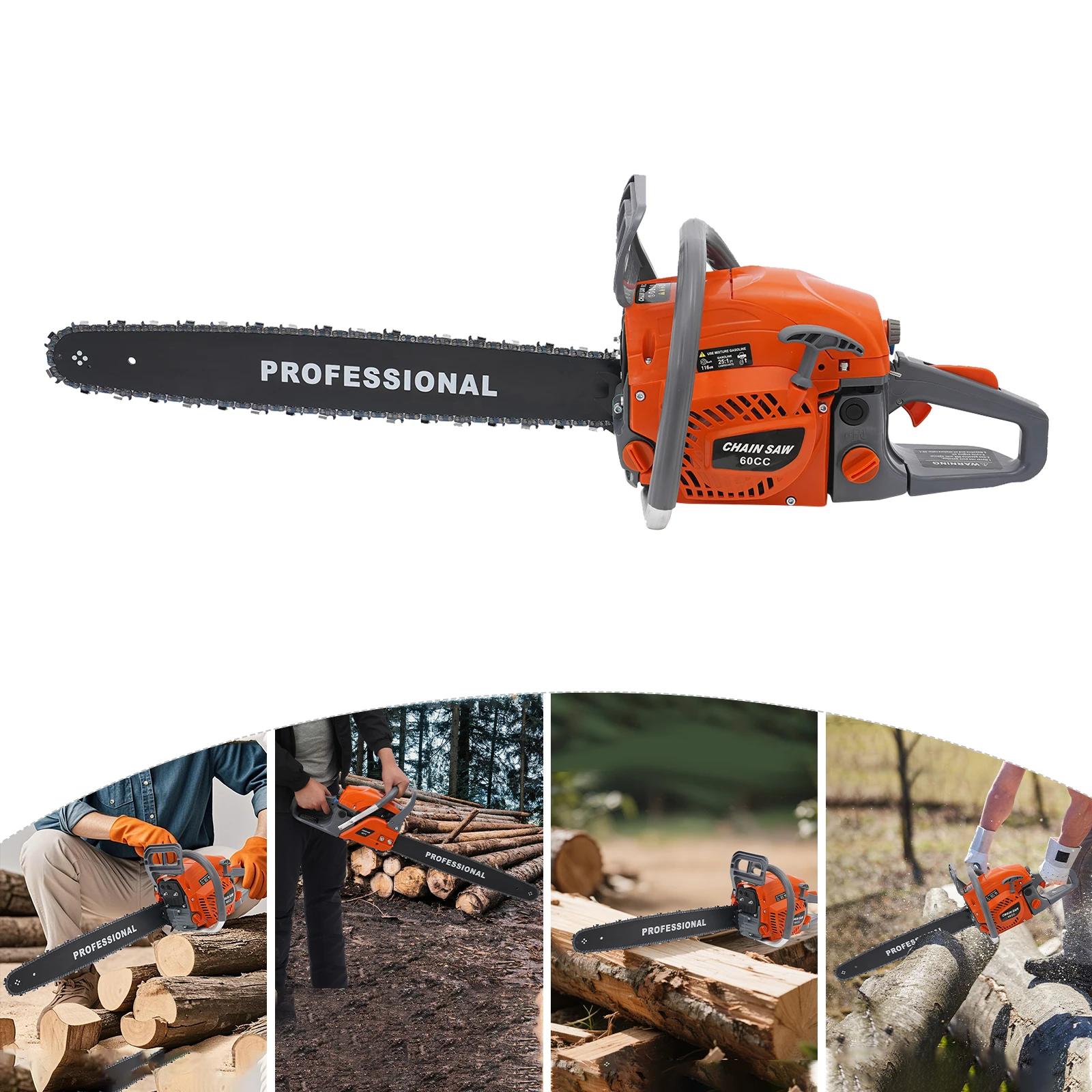 Excellent Performance: The 2-stoke engine with 60cc displacement, 10000rpm high speed, and 2.8KW high power, the high-magnetic flywheel with thickened blade design, the filter, the pressure-reducing valve, and the 22" guide chain can achieve fast cutting, thus providing excellent performance(about 22" cutting diameter).