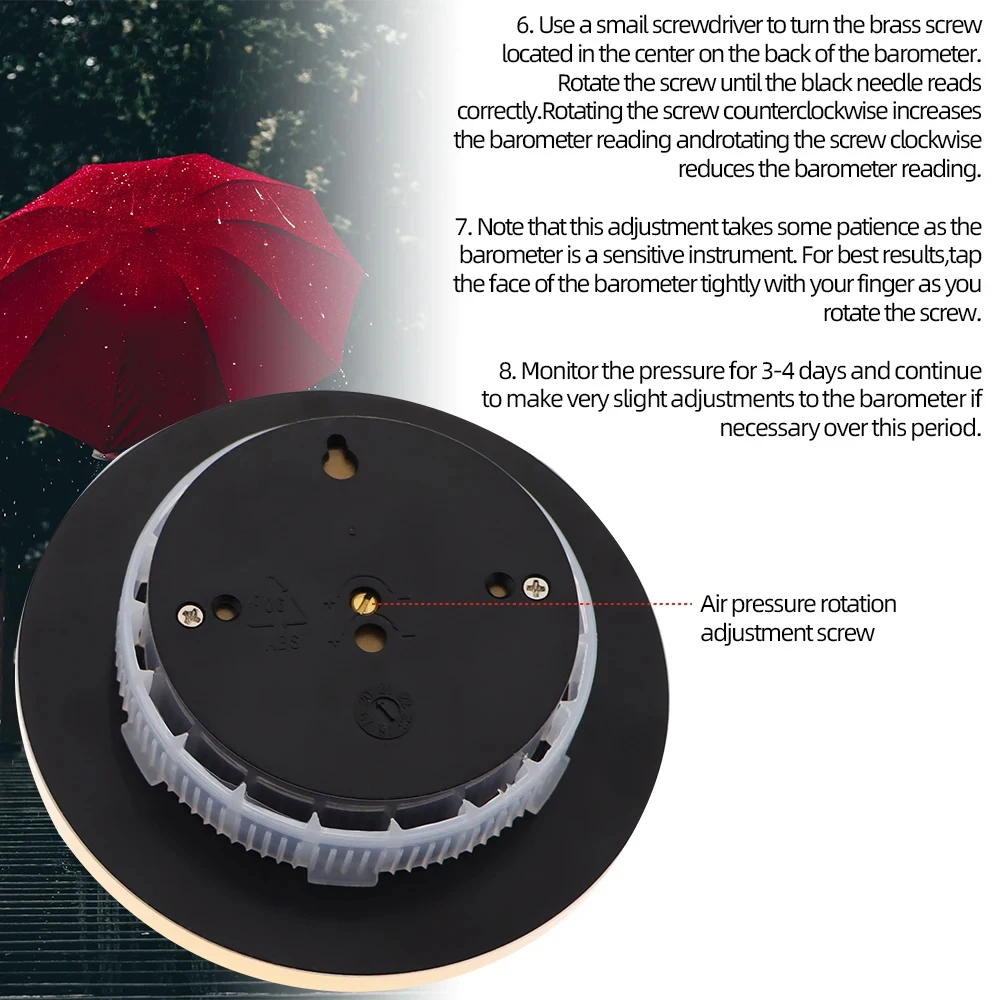 2.Use a small screwdriver to turn the brass screw located in the canter on the back of the barometer .Ratate the scrww until the black needle reads correctly.Rotating the screw counterclockwise in creases the barometer reading.