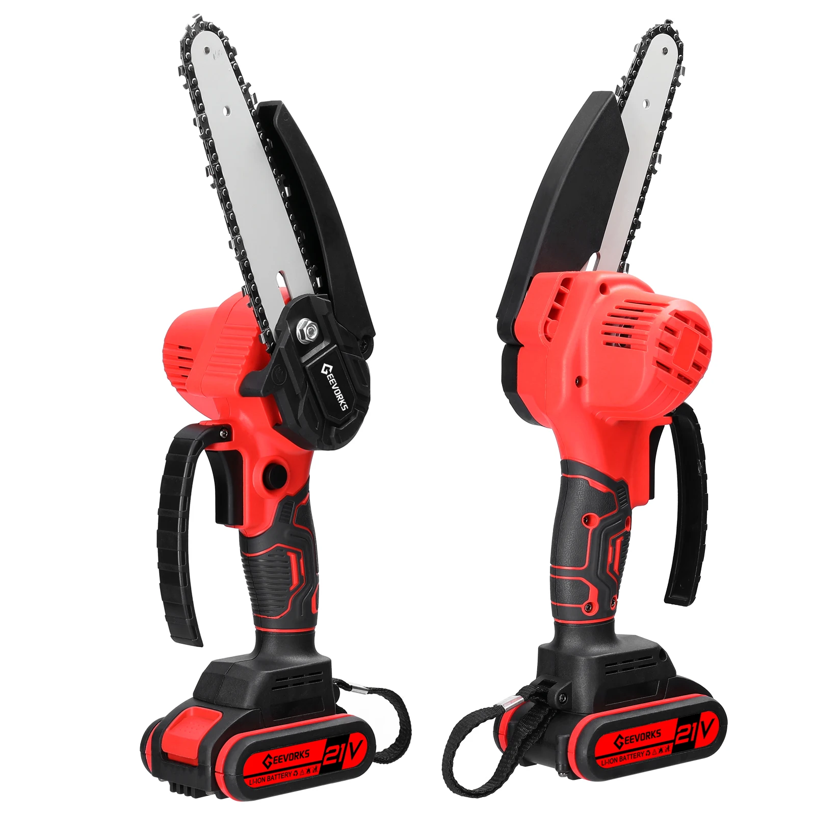 This is a kind of quality 21V 6inch chainsaw and 21V electric pruning shear set, lightweight and portable, the handle is easy to use and effort saving. Comes with a plastics carrying box, wear resistant and impact resistant, easy to carry, providing quick and convenient mobility and storage in a complex environment. Wide applications, it can be used for fruit picking, gardening design, flower market pruning, farm picking, cutting trees in orchards, pruning branches in municipal gardens, splitting firewood and etc.