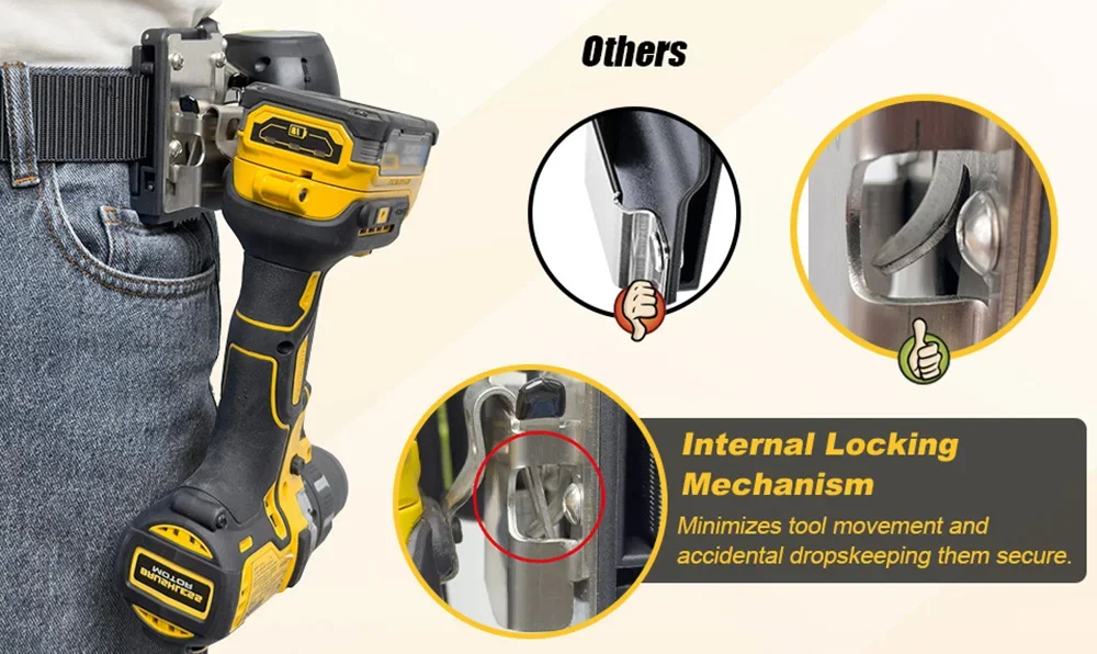 Dual Locking Belt Clip: The bottom of the holster features a safe and convenient lock structure, allowing you to effortlessly secure your drill. Simply press the buttons on both sides to quickly open it, ensuring hassle-free access while maintaining utmost safety