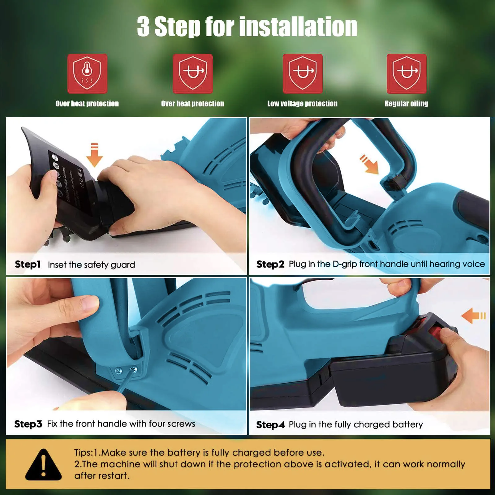 Multi protection design: The D-shaped handle makes the hedge trimmer wireless, equipped with a battery and charger, providing a balanced grip and powerful cutting of the hedge. A well positioned tip guard can protect the blade from walls and fences, and there are also guards on the front and sheath, making it very convenient and safe to use.