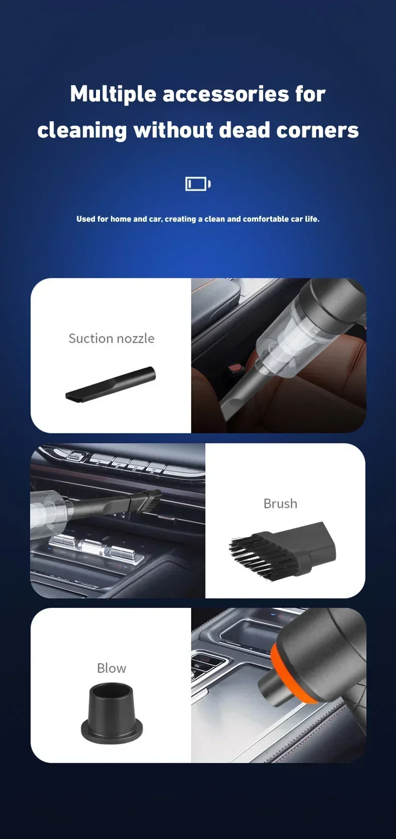 *High-power suction: The powerful motor generates 690000PA strong suction to suck away dust, hair, debris and other dirt in the car.