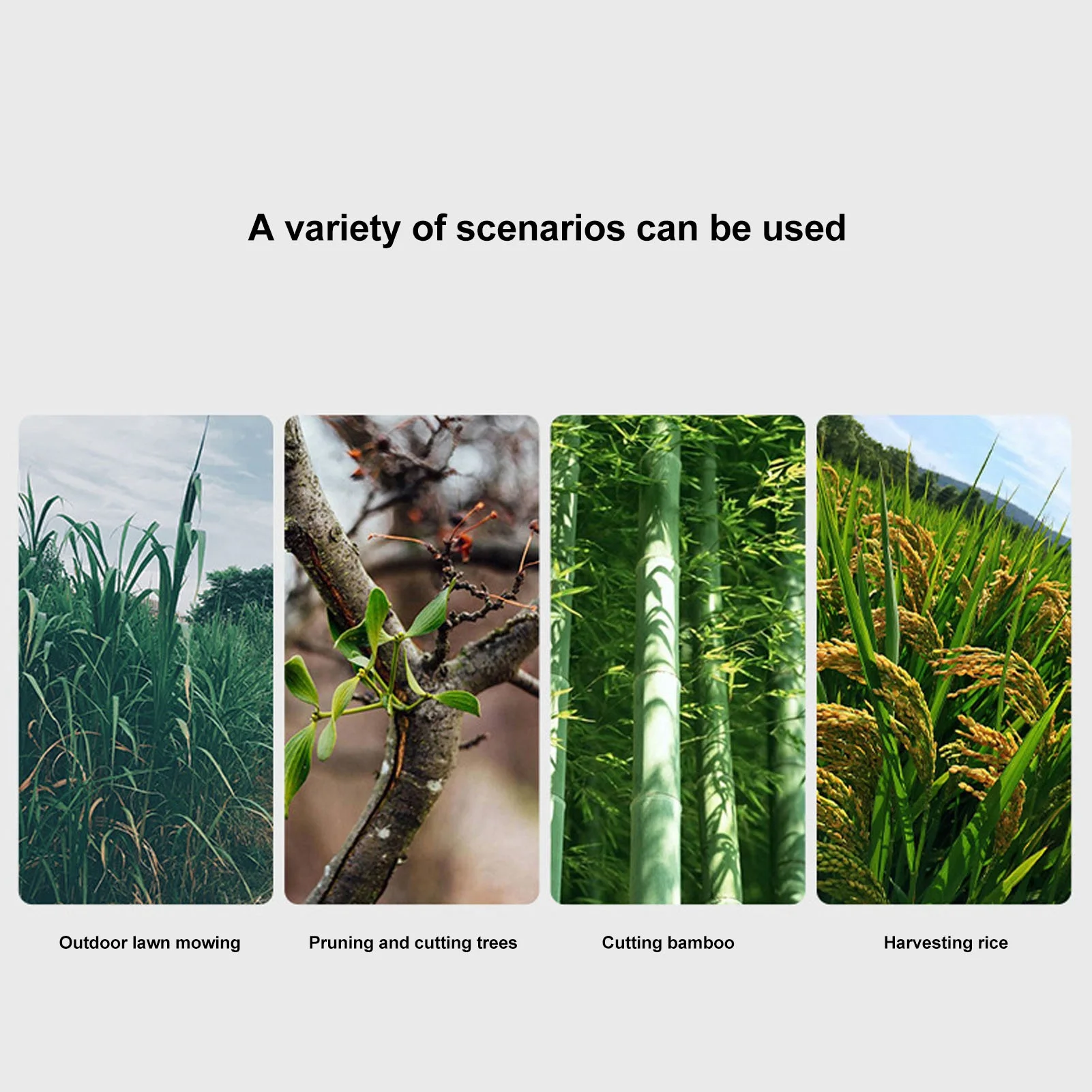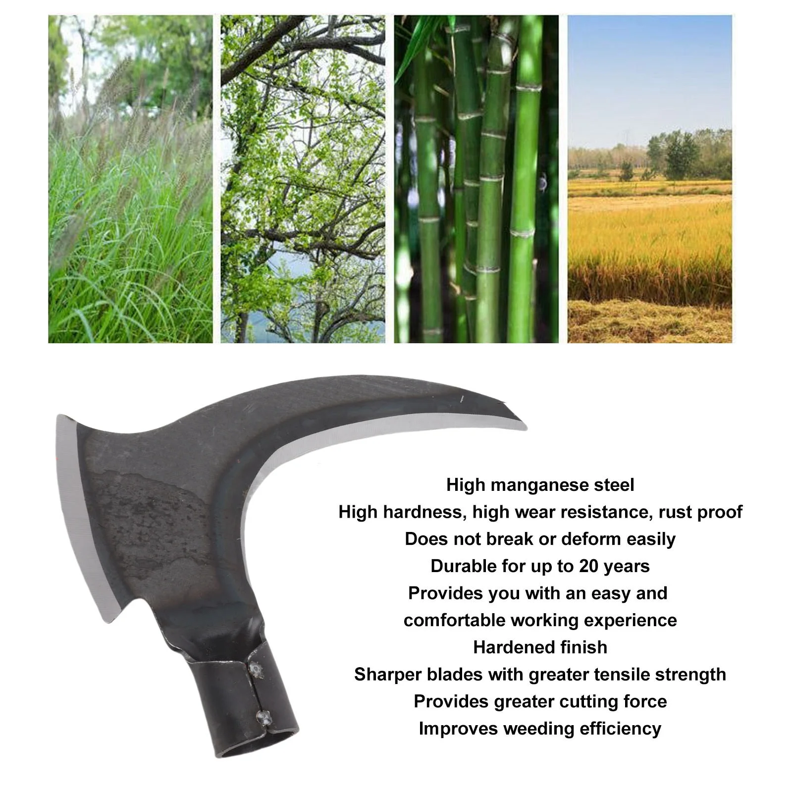 Features 1、HIGH MANGANESE STEEL: Handheld sickle is made of high manganese steel, which is hard, wear proof, rustproof, resisting to breakage and deformation, and sturdy for up to 20 years. 2、INCISIVE BLADES: By hardening treatment, the incisive blade has greater tensile strength and can provide greater cutting force, thus improving the efficiency of weeding. 3、EASY AND COMFORTABLE: Double scythe brings you an easy and comfortable working experience to enjoy all kinds of garden work and is a great gift for anyone in your life who loves gardening. 4、IDEAL GARDENING TOOL: High manganese steel double sickle is easy to install and use, and weeding is easier, and it's also fun, making it an ideal gardening tool. 5、RANGE OF APPLICATION: High manganese steel double scythe is suitable for outdoor grass cutting, vine trimming, tree pruning, firewood cutting, rice harvesting, etc.