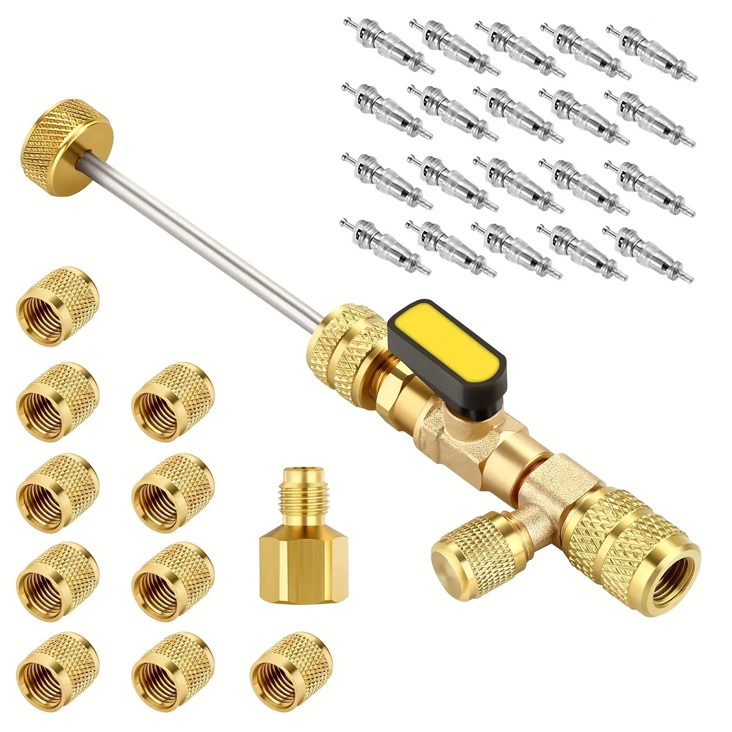 Dual Size 1/4" & 5/16" Port Valve Core Remover Installer Kit Tool with 10PCS 5v1 Valve Cores and Double Head for Refrigerant