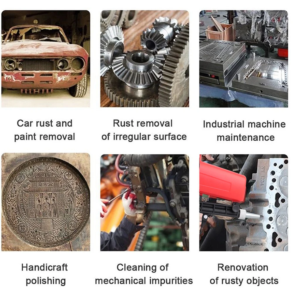 Pneumatic blasting gun use: dedicated to all kinds of light and small metal corners, spray polishing, raw edges, rust removal details.