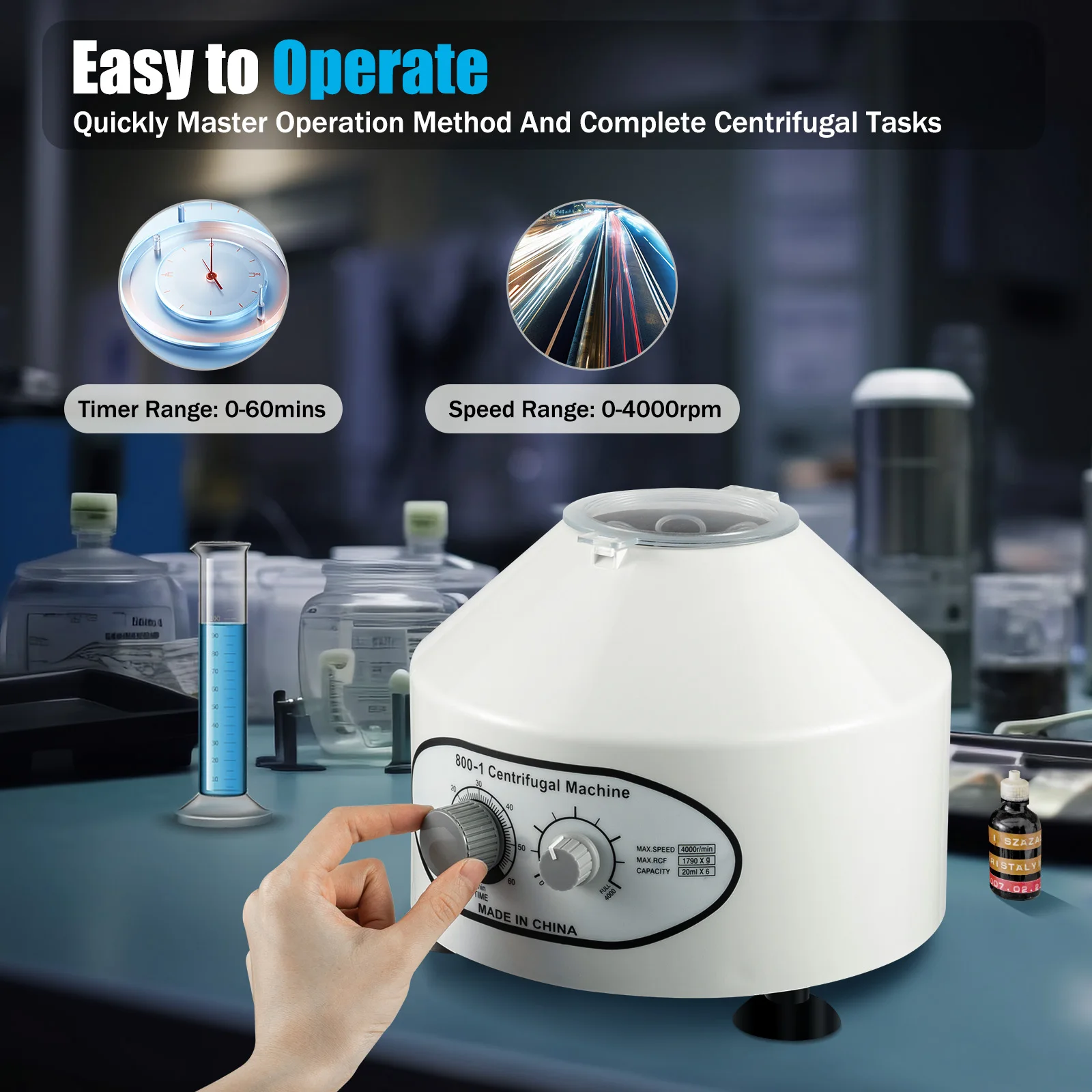Easy to Operate: The control panel is clear and intuitive. The two independent knobs allow you to set the speed and time easily, ensuring that even first-time users can quickly master the operation method and complete centrifugal tasks.