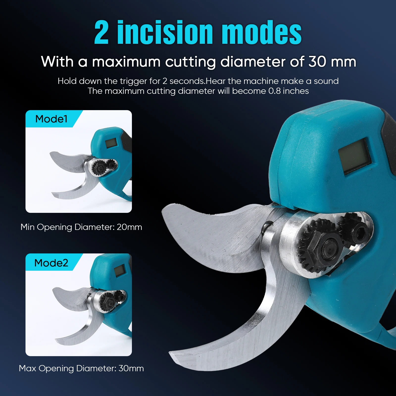 Intelligent Closing: In the power on state, press and hold the trigger for 5 seconds, and the scissors will close without opening. Pull the trigger twice in a row to open it.