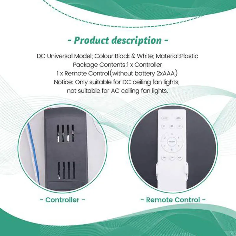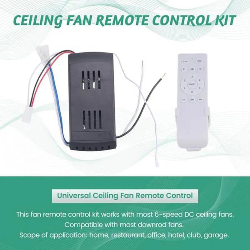 [Universal Ceiling Fan Remote Control]Easy to install, no need to remove bulbs and fans. Only wires need to be connected. This fan remote control kit works with most 6-speed DC ceiling fans. Compatible with most downrod fans. Scope of application: home, restaurant, office, hotel, club, garage. Notice: Only suitable for DC ceiling fan lights, not suitable for AC ceiling fan lights. Note: Batch different appearance slightly different, does not affect the use of