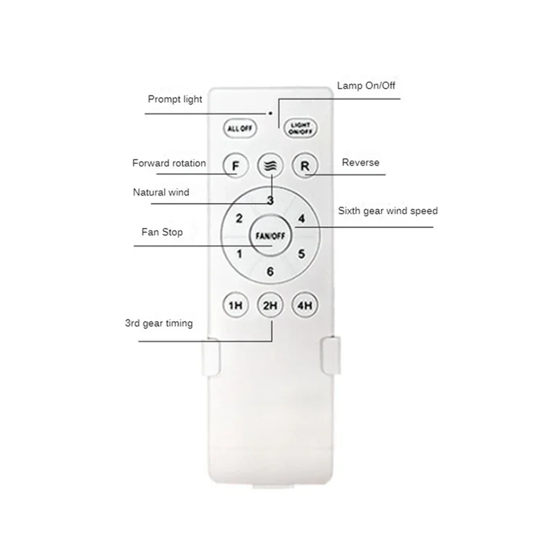 [Multifunctional Ceiling Fan Remote Control]This fan remote control kit can convert a normal ceiling fan into a remote control. 6-speed (high/medium/low) and off; 3 timing remote settings and control buttons: 1H, 2H, 4H; adjustable forward and reverse. 1 button for light on/off control.(no dimming).