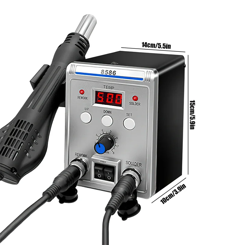 Hot air gun: Air flow rate 120L/MIN (maximum), brushless fan, gentle air temperature range 100-500℃, temperature stability ±2℃, handle wire length 1.2 meters