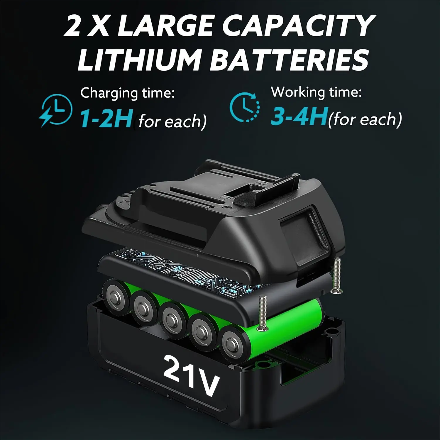 Battery: 2 * Rechargeable Batteries, 21V, 1500mAh (included)