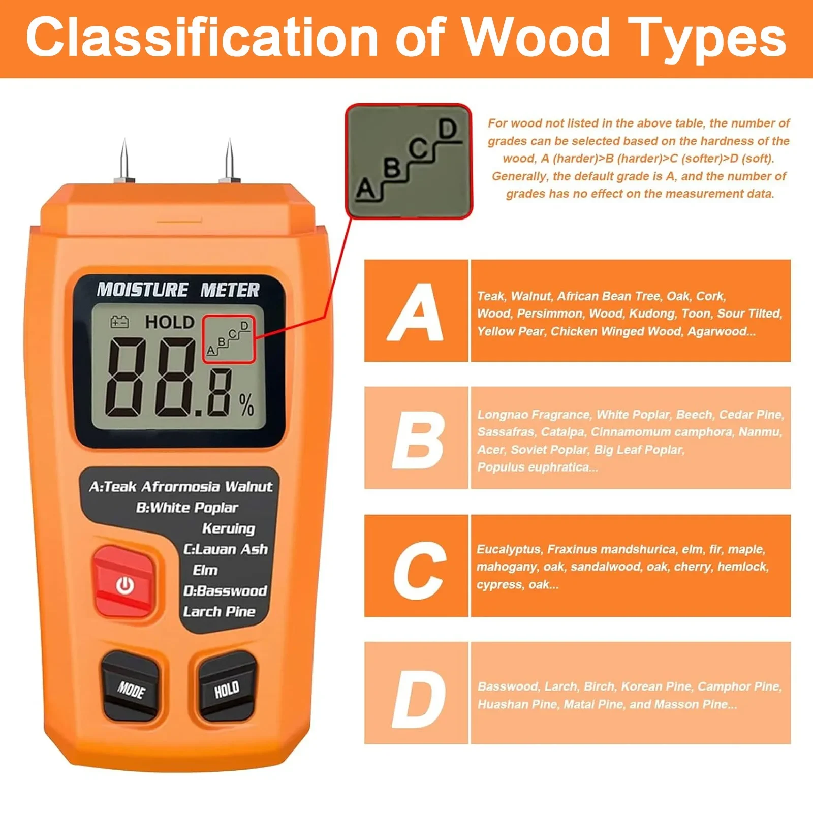 【Accurate measurement】 The wood moisture tester has a resolution of 0.1%. Accuracy: 0.5% The moisture meter has 4 modes. Measuring range: 0.9% ~ 99.9% The Wood Moisture Tester Detector comes with 5 calibrated scales to measure different types of materials.