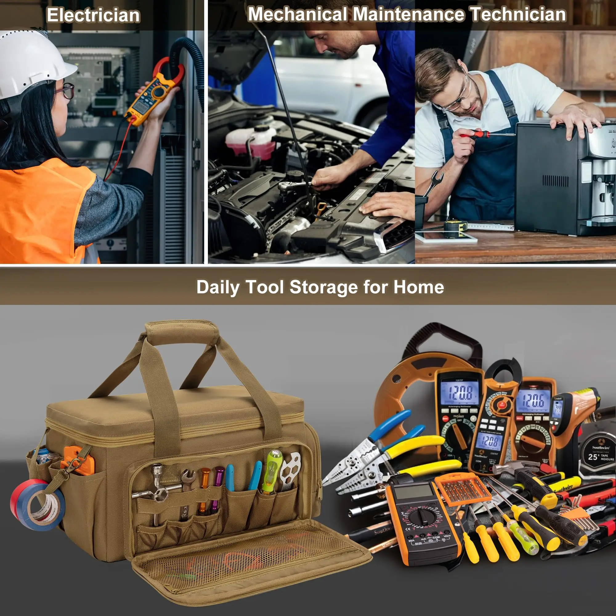 DIMENSIONS - 14.4 x 8.5 x 8.1 inches. Hand tool organizer bag is widely used in industry, home improvement, outdoor maintenance and so on. Solve the problem of cluttered storage, so that the tools can be categorized at a glance. Suitable for repairman, electrician, carpenters, handyman.