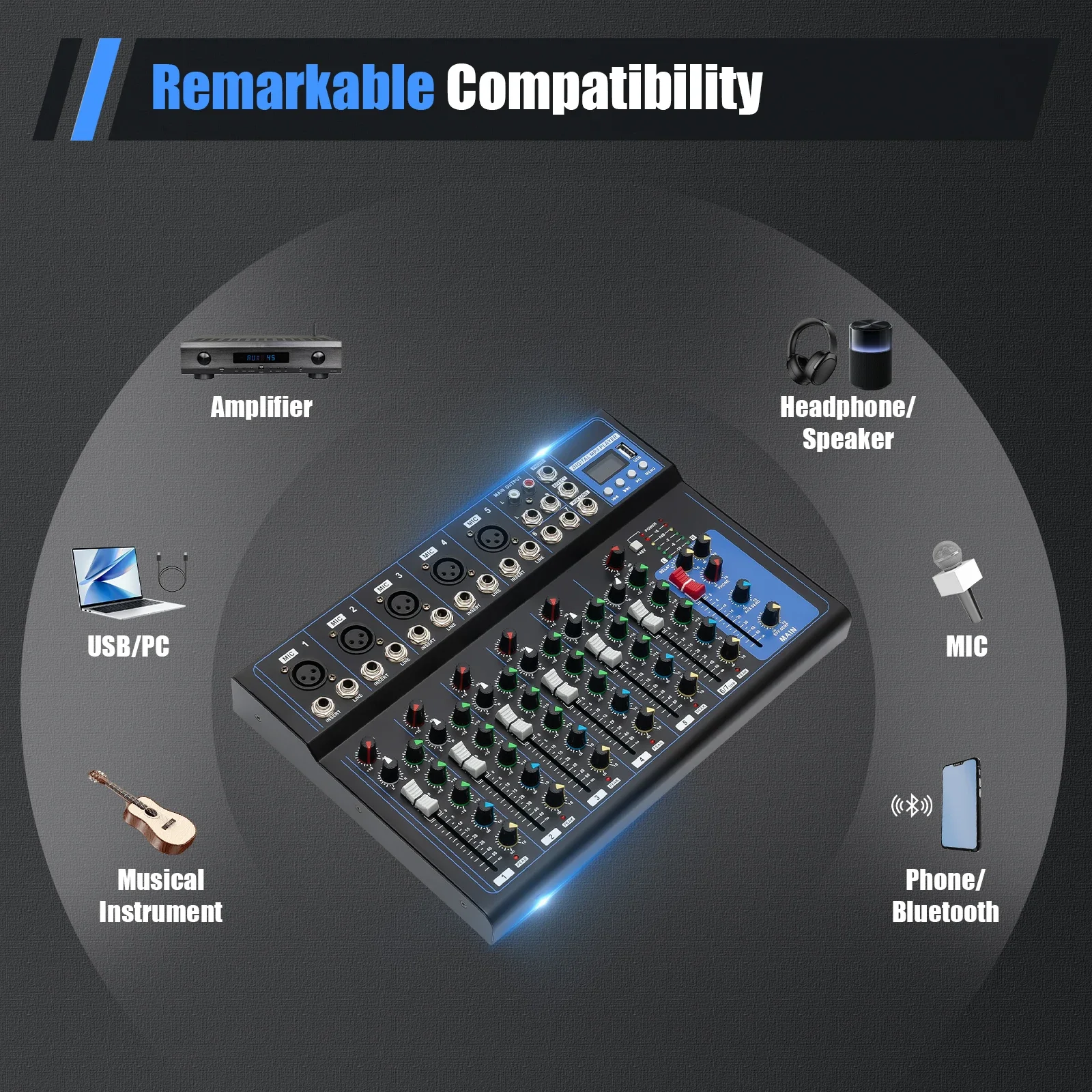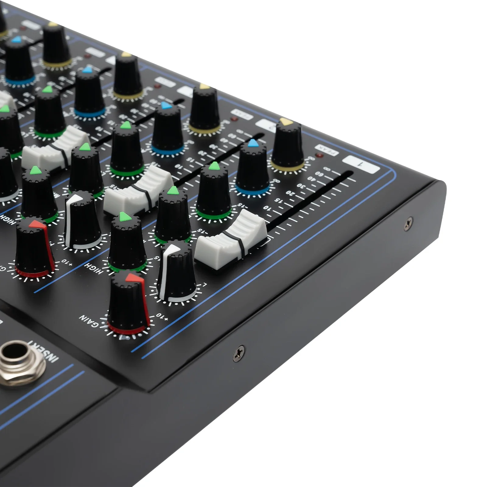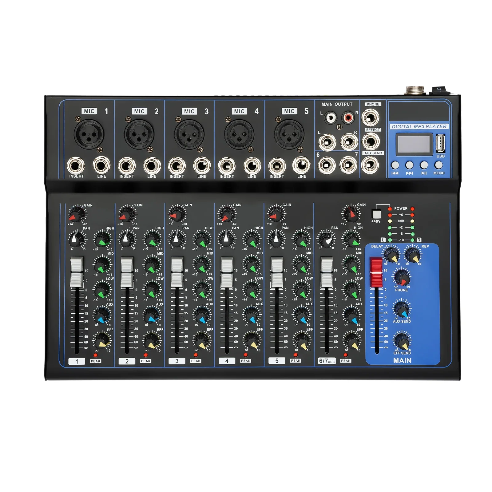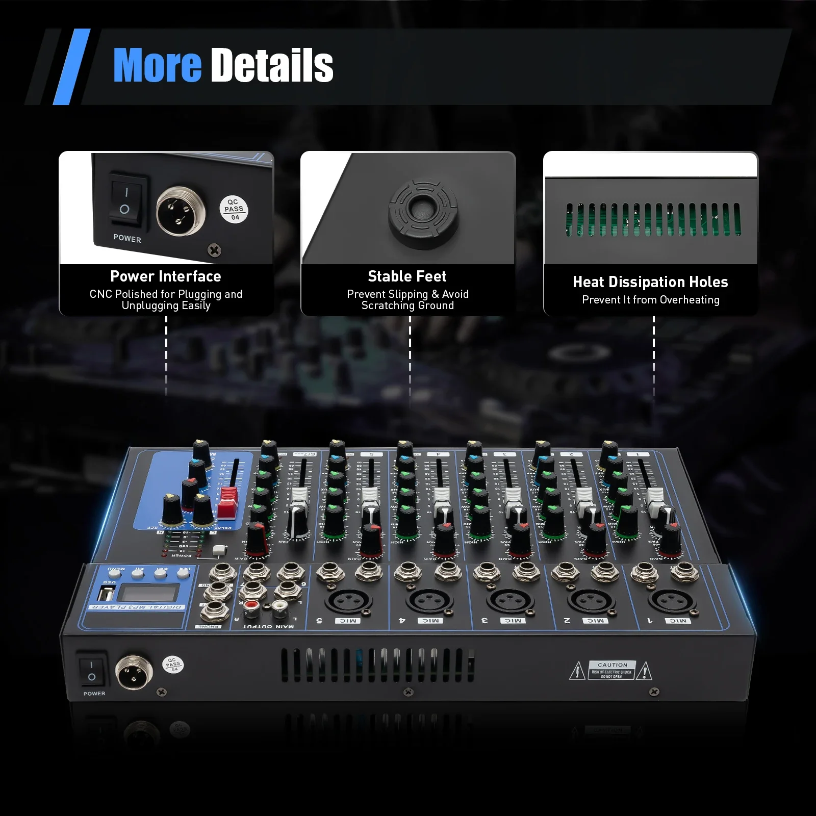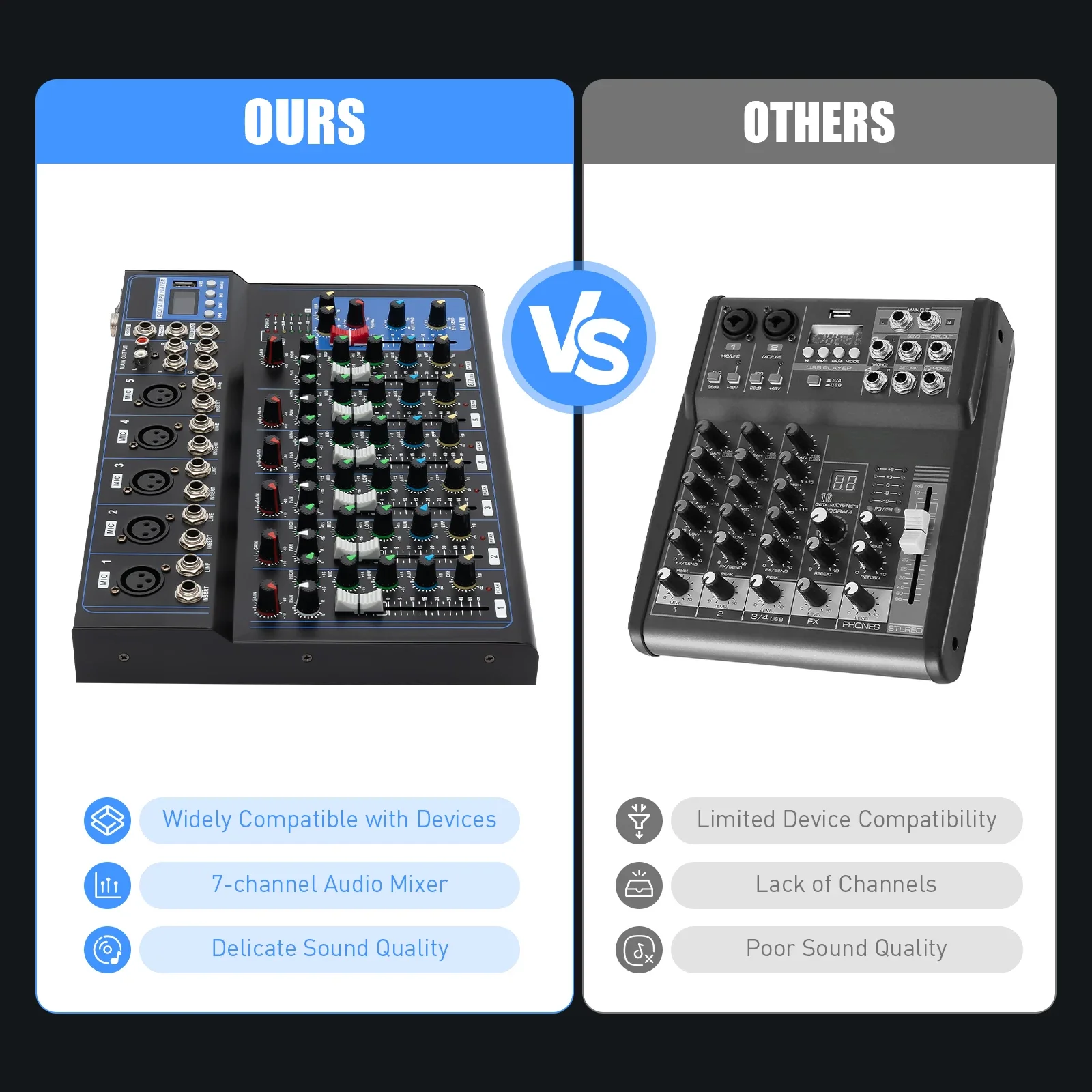 This 7-channel audio mixer has excellent functionality and simple operation, which can flexibly adapt to your various audio needs, bringing you and your audience a clear and high-quality audio experience. Whether it's home recording or professional performances, this mixer can be your ideal audio partner. Choosing it not only enhances your audio production experience, but also makes your creative process smoother and more efficient.