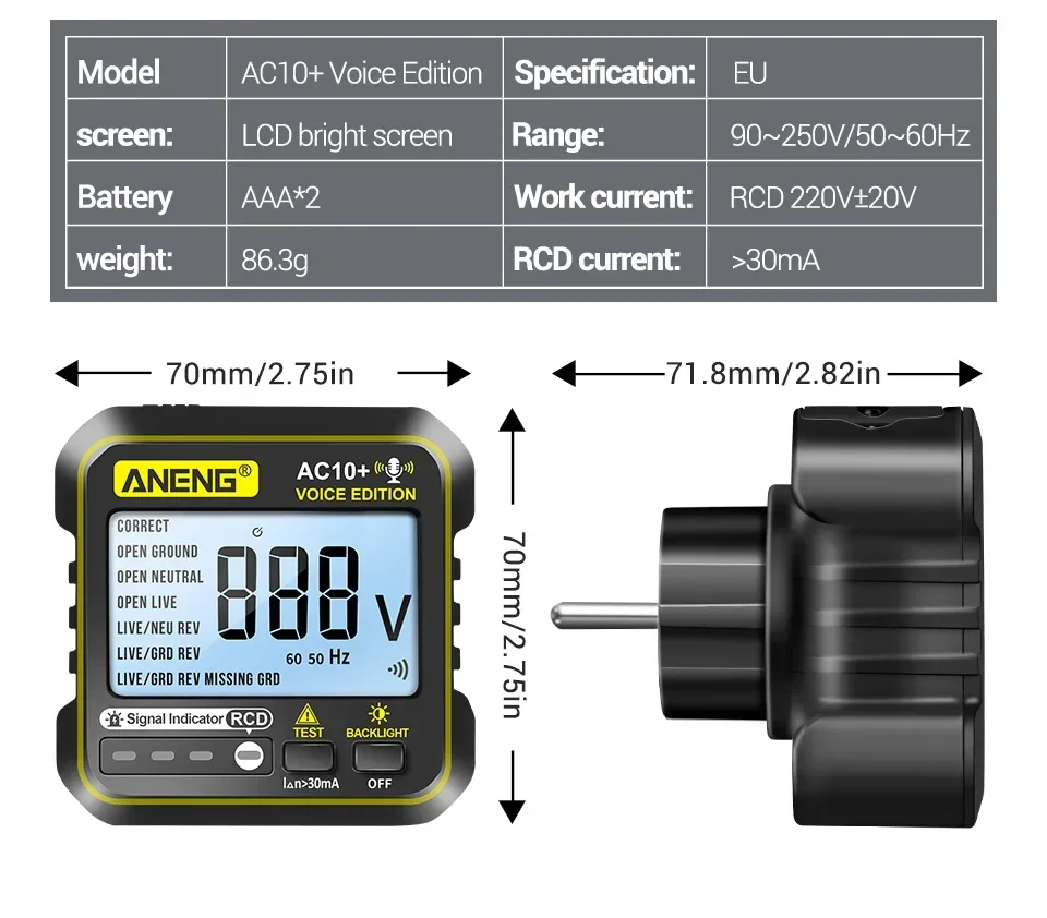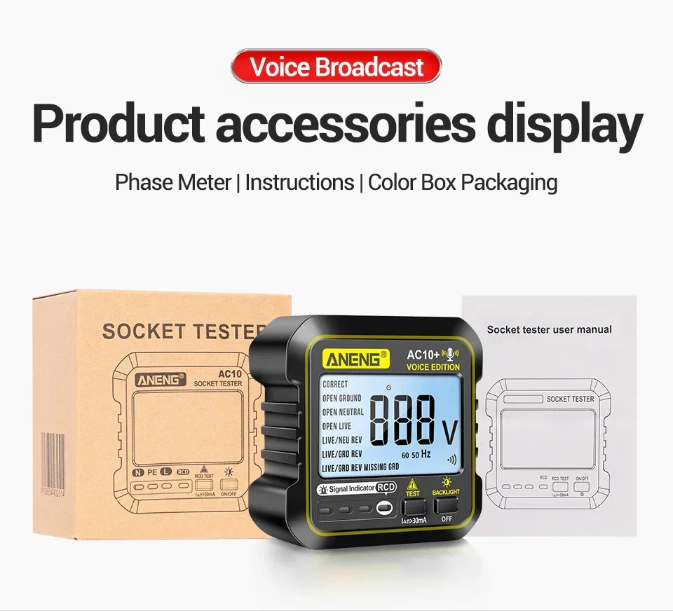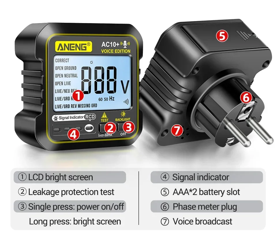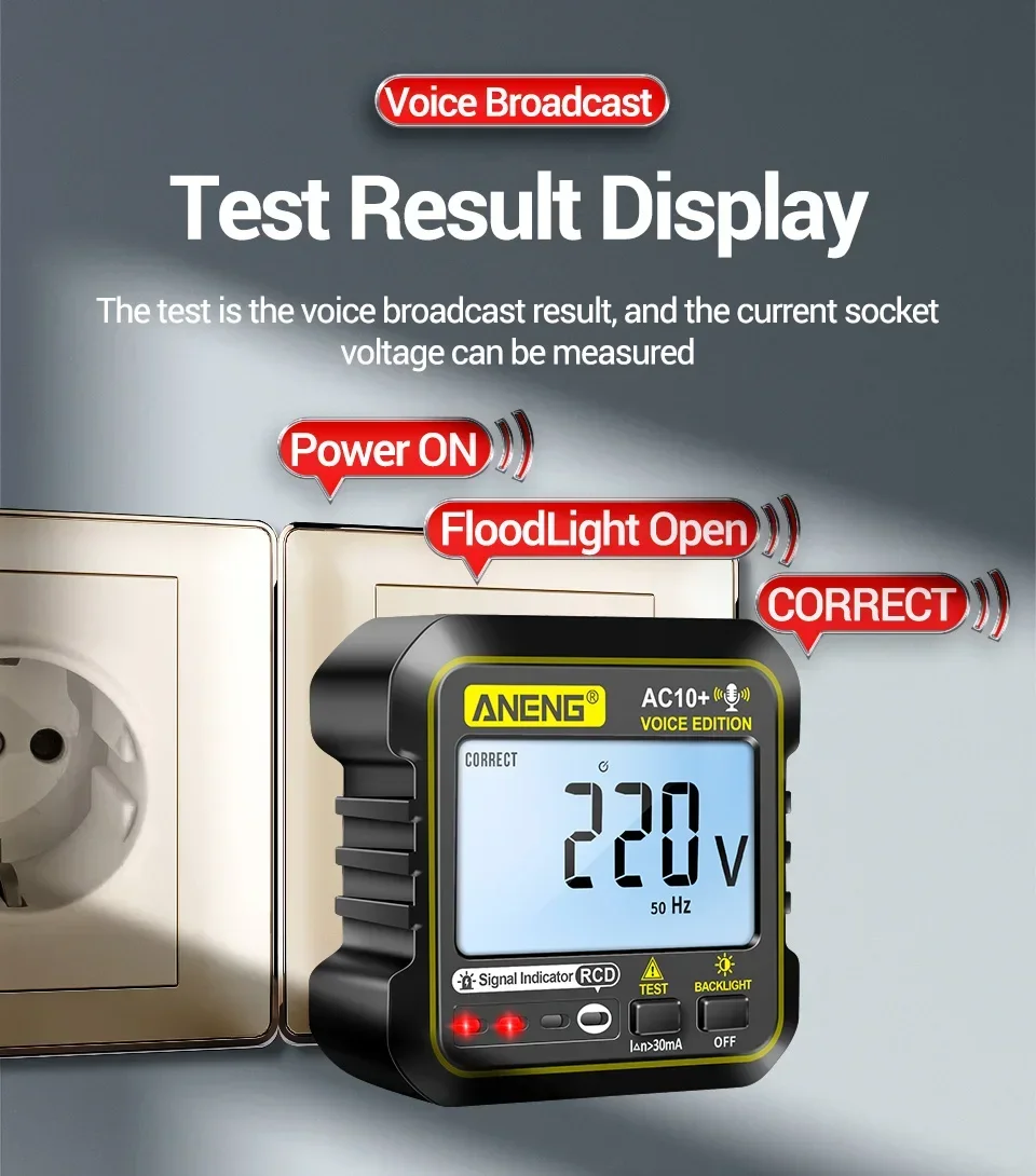 ANENG AC10+  socket tester are mainly used to detect polarity of power socket and safety of leakage switch. It can quickly and accurately detect the wiring of the socket.Simuitaneously, it can test the socket voltage and show on the LED screen.
