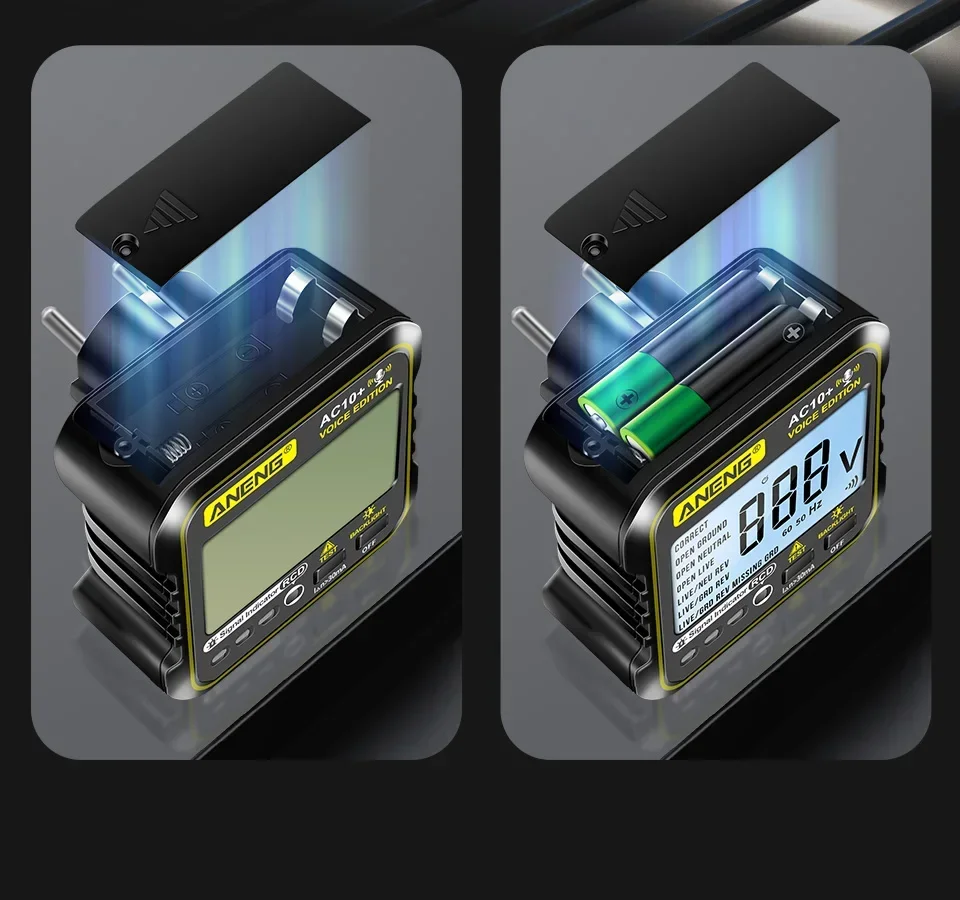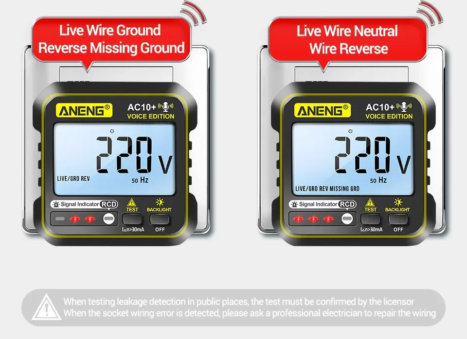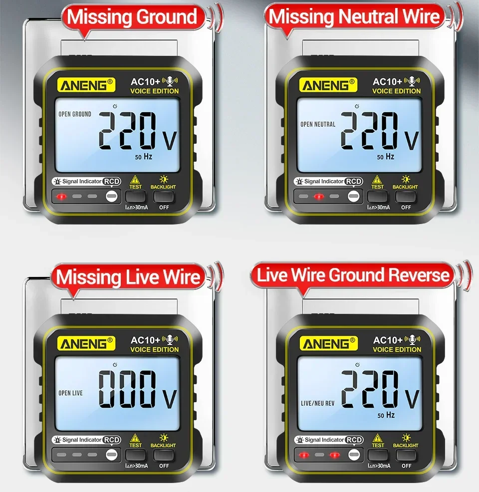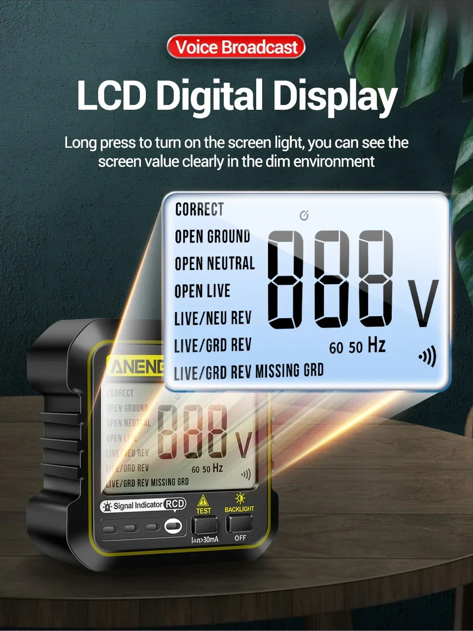 ANENG AC10+  socket tester are mainly used to detect polarity of power socket and safety of leakage switch. It can quickly and accurately detect the wiring of the socket.Simuitaneously, it can test the socket voltage and show on the LED screen.
