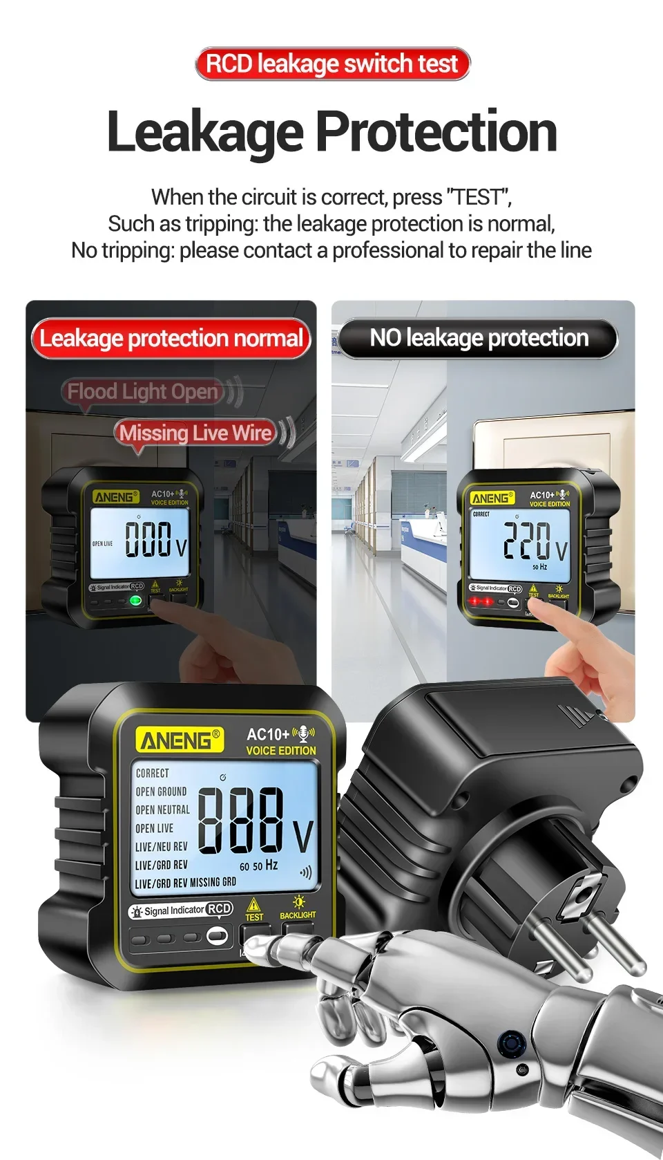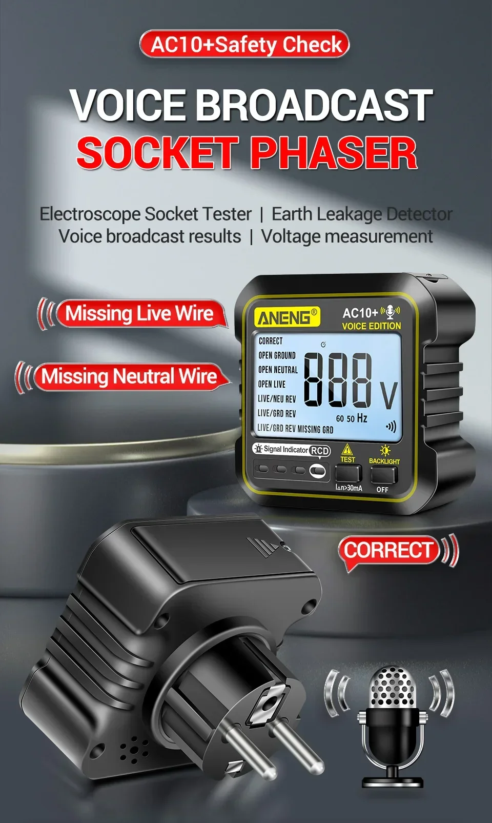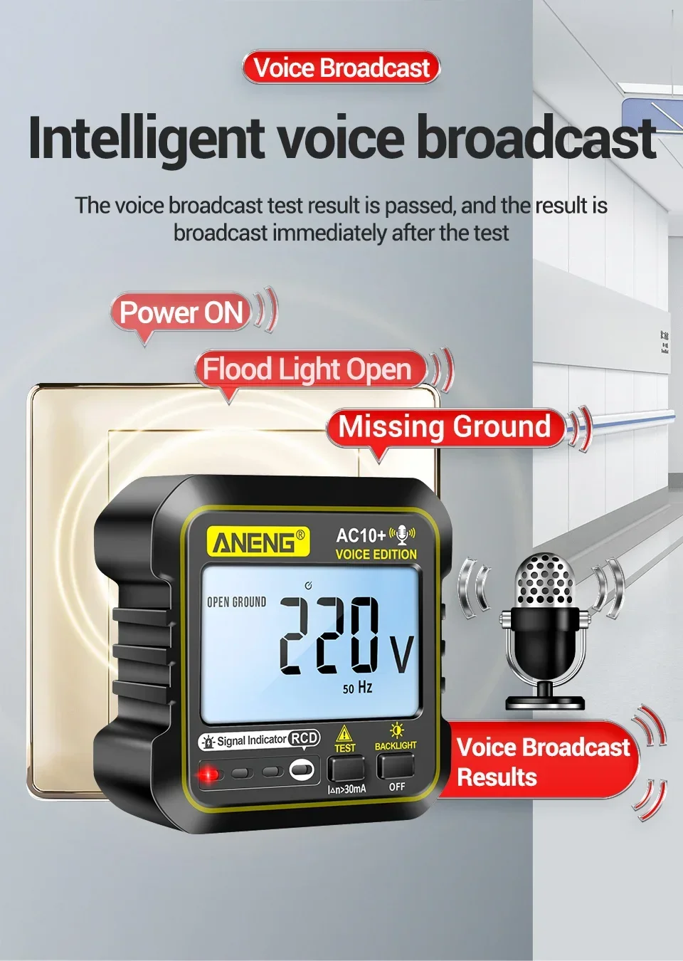 Socket Tester ANENG AC10+ Voice Broadcast Voltage Tester Circuit Breaker Finders US/EU plug Polarity  Socket inspector tools