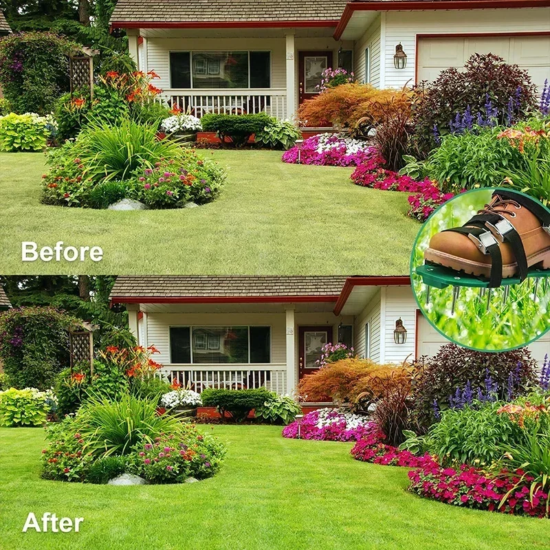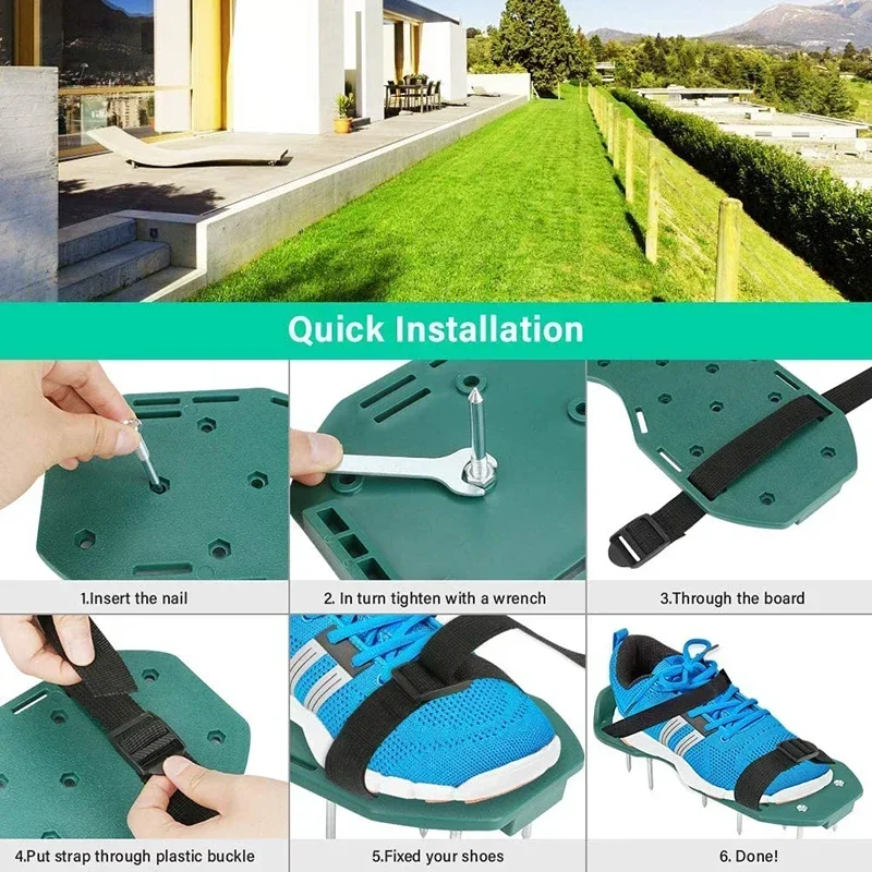 Inflatable shoes with 13 hardened galvanized layers, each shoe has 5 cm long nails. The shoes are made of durable plastic with kicks on the heel to eliminate dust or turf accumulation. This will help the lawn absorb water, air and nutrients into the root area of the lawn.