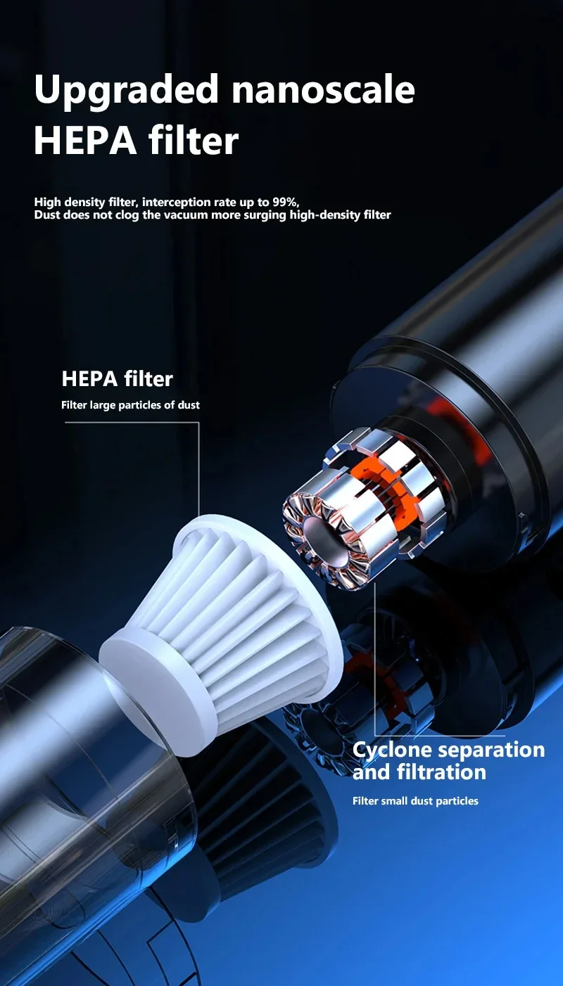 4.Upgraded nanoscale HEPA filter:High density filter,interception rate up to 99%,Dust does not clog the vacuum more surging high-density filter
