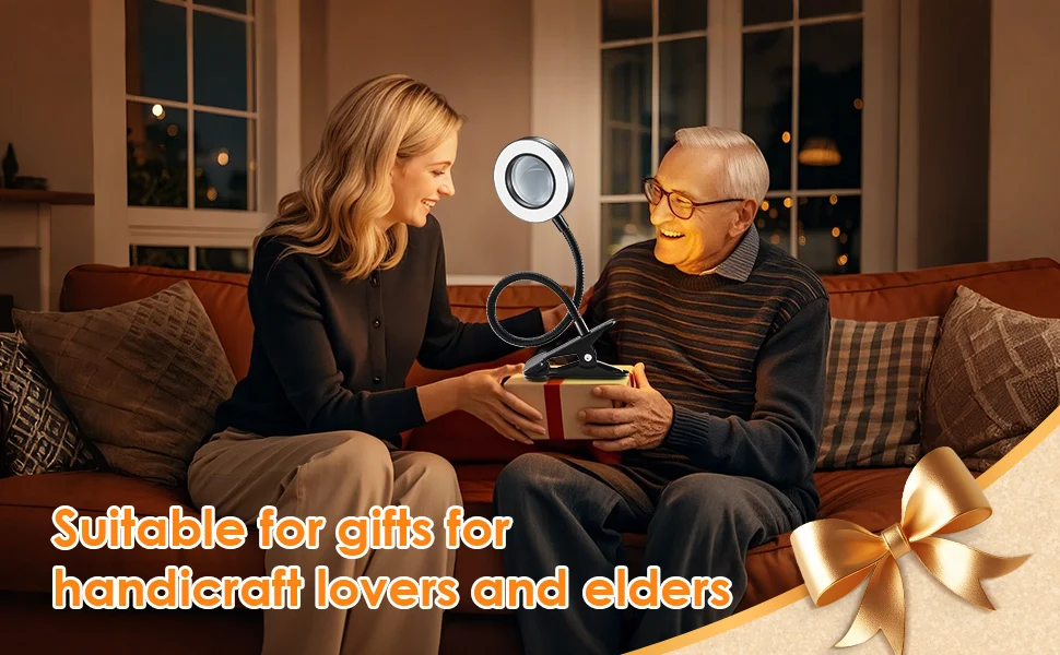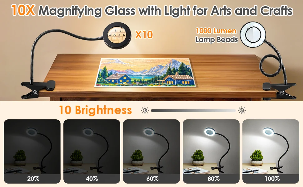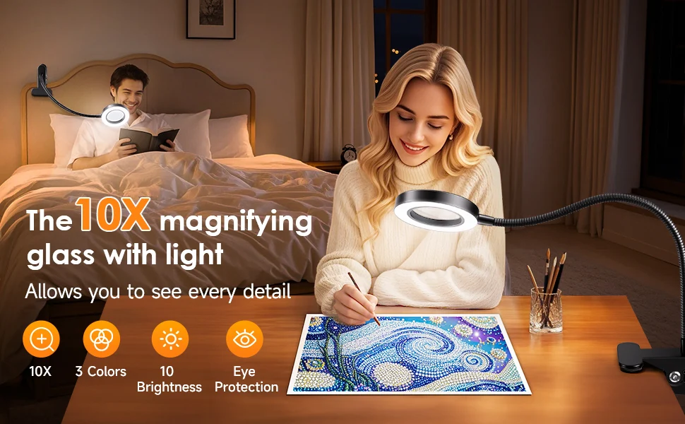 The lighted magnifying glass with light features 10X magnifier with a 3.7" real glass lens that provides a clear and distortion free view. The 10X magnifying glasses with light & magnifier with light hands free is especially suitable as a reading light for bed, clip on light for bed headboard, reading lamp for avid reader; nail light for desk ring light for desk light, nail lamp for desk lamp, nail desk lamp, nail desk light for manicurists; craft light, workbench light, craftsman light, puzzle light, puzzle lamp, art lamp, sewing light, work lamp, hobby light. Our magnifier with light is designed to meet yr all needs.